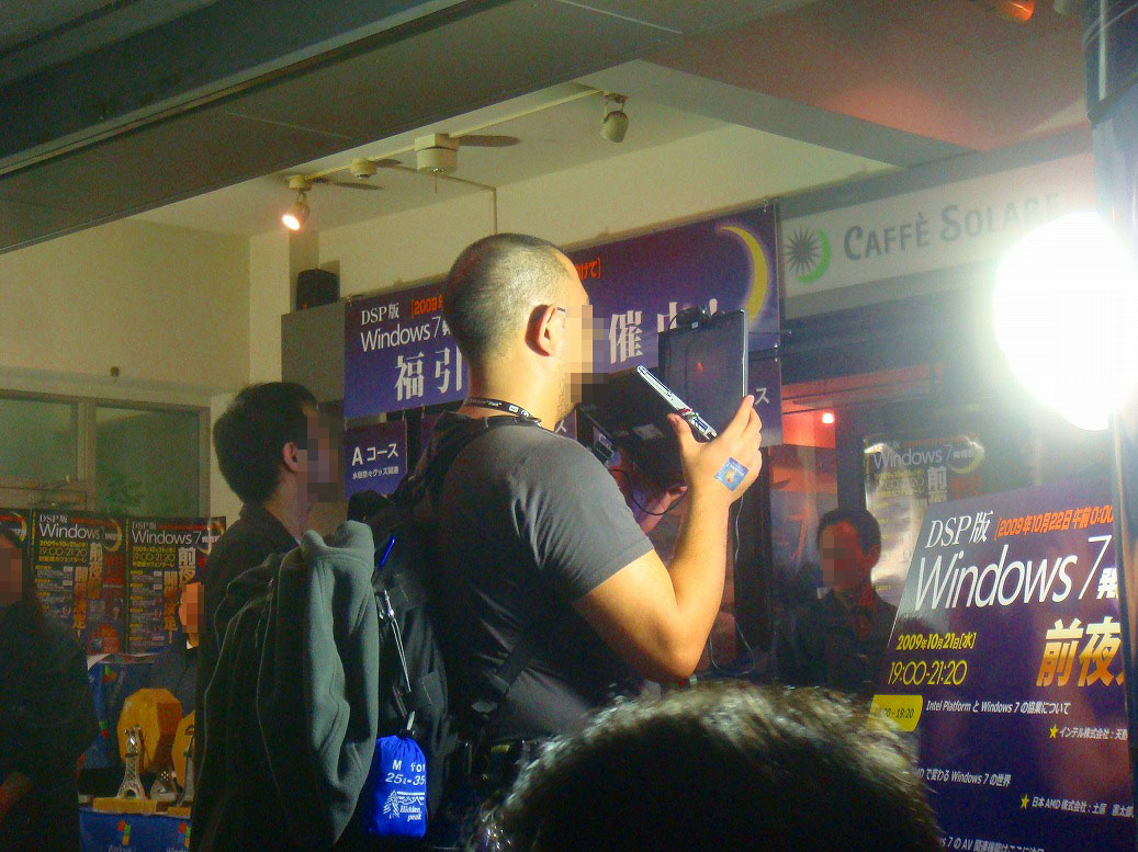 改札を出て思ったのは 平日にしては人が多い!!ということである、 この時点でもう雰囲気が違う。 とりあえず様子を見ようと思ってパーツ街へ。 情報収集をしていた。 とにかく人が多い 暇人多すぎだろw というわけでとりあえずクレバリーに行って 支払いを先に済ませて抽選券をゲット そのあとたもさんから連絡があって intelSSDを買ってきてほしいとのこと。 そのころマックでお茶していたのですが たもりの頼みじゃ仕方ないので intelSSDの市場調査を開始 バルク版の最安値はドスパラっぽかったので ドスパラで購入 ドスパラでもWin7のキャンペーンを行っていて 5000円ごとに抽選券が一枚もらえるとのこと。 SSDは23980円だったので 計4枚ゲット! あたるといいな~って若干期待しながら抽選箱に券を入れた。 発表は23時過ぎらしい。 ちなみにクレバリーの抽選会は21時過ぎから。 まだかなり時間があった。 そこでガネが向かったのは Ark!! ガネのかかりつけの店である ホントはオーバークロックワークスに行きたかったけど あそこは平日休みだからさ;; っつーわけでアークでメモリを見てた 30分は見ていたのだろうか そこで一目ぼれしてしまった DominatorGT!!! DDR2000 CL8 1.65v こいつ35800円もするんだ でもIYHしちった^^ 後悔はしていないが反省はしている。 というわけでWin7の深夜販売の空気にやられた若造がここにいます。 メモリ買った後は カフェソラに行って Win7のイベントに参加。 AMDの兄貴こと土井憲太郎氏のトークイベント すごく興味深い話だったけど AMDひいきの話ばっかで正直つまらん。 intel最強!! なんかノートPC使ってニコ生中継してるおっさんがいたのでパチリ。 トークが終わり イベント会場から出ようとしたとき TWKRの単語が聞こえたので速攻で会場にトンボ帰り!! 予想通りじゃんけん大会だった TWKRゲットのチャンスktkr!!!!! っつーわけでじゃんけんに参加しましたよっと、 結果としてはだめだったんだけど 最後の4人まで残ったんだ。 結構健闘したと思うんだ。 微妙なテンションの中 お姉さんにこれやってもらった^^ 俺って毛が濃いな(;´∀`) まぁそんなことはさておき… 21時すぎたのでクレバリーの抽選会に参加 結構後ろのほうに並んだと思ったのに 結果はうまい棒っていうwwww ちくしょーーーーーーーーー またまた微妙なテンションの中 次はドスパラのイベント会場に移動 ドスパラはさすがに人が多くて中に入れなかったけど 外側の最前列を確保 兄貴のトークイベントPart2をみて NVIDIAの方のトーク見てたら ビリー隊長から連絡 隊長を待たせるわけにはいかないので そっと列を離脱。 すぐに隊長とは合流できたので 隊長のWin7の金を払うためまたクレバリーインターネット館に移動 金を払ったあと 隊長も抽選会にギリギリ参加 結果はうまい棒wwww でもそのあと事件は起こった 隊長の次にガラガラを回したおっさんが PS3当てやがったwwwwwww 隊長が回したときにはもうすでに数個しか玉が入ってなかったっぽいんだけど 自分がまわした後に当たりがでるってせつねぇwwww ガネも自分のことのようにテンション落ちまひた;; そのあとは裏路地でちょいgdgdタイム そのときに俺らは気づいたんだ。 電車ヤバクね?!?!?! ネットで調べたらホント電車ヤバかった 少しでも受け取る時間を早めようと 23時前にはクレバリーのインターネット館前に移動 したんだけど・・ そこにはすでに行列ができ始めていた。 ホント早めに気付いてよかった!! 隊長ありがとう 隊長に列を確保してもらっている間に ドスパラの抽選会に行ってきました 結果は おしい!!!!!!! ガネの番号はxxxxxx7だったんだけど intelSSD160GBの当選番号は xxxxxx9だったの!! 涙がでそうになるのをこらえて ビリー隊長のもとへ。 割と早めに並んでいたおかげで 一番初めのグループで入店 そのあと32bitと64bitの組に分かれたんだけど 64bit買った人多すぎwwwwwww 32と64の割合は 3:10 っていても過言ではないくらいの比率でした。 やっぱこれからは64bitの時代なのかねー 0:05に店をでて駅までダッシュ!!! ホントギリギリ終電に乗れました^^ というわけで今日は自分の部屋に帰れそうです。 おわり。 ちなみにこのブログは電車のなかでノートPCつかって書きました。 それだけです。