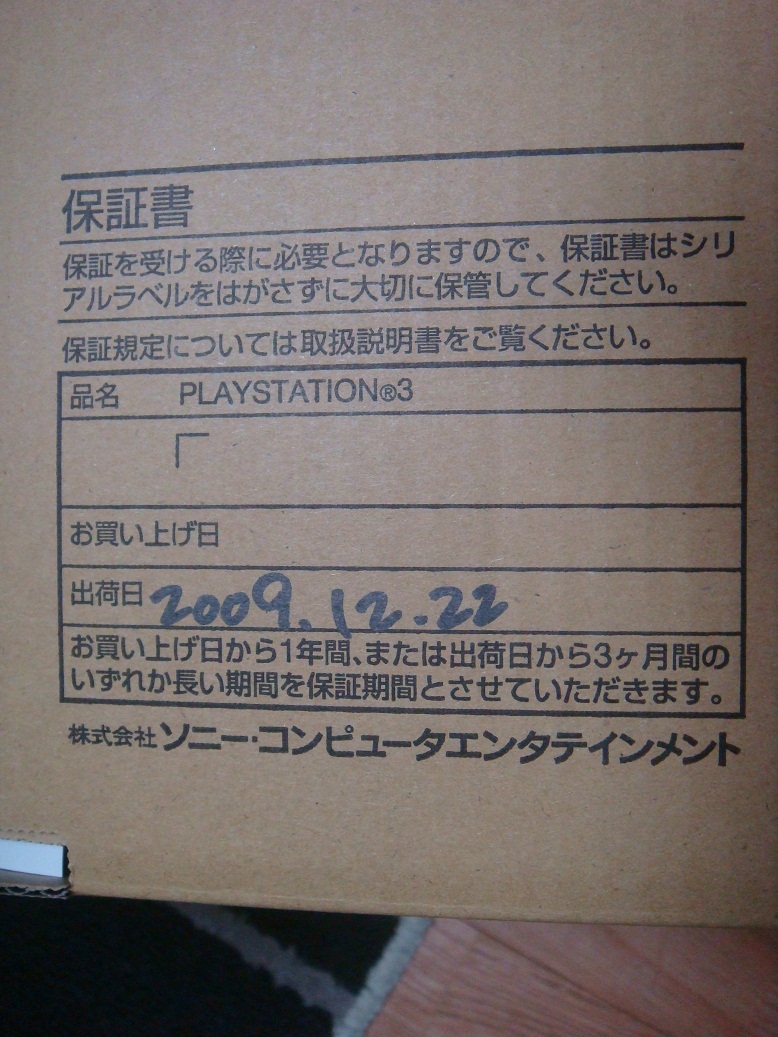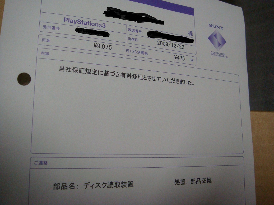 ネギま!をパソコンで見ながら スパ王を食べていると チャイムが鳴り でてみると佐川のおじさんでしたー^^ バカでかい箱をもっていましたよ。 っていうわけで受け取ったのがこれだぁぁぁーーー こっちから送ったときに そこらへんに転がっていた ボロボロのダンボールで送ったのに こんなに立派な箱に入れて送ってくれました。 中をあけると二重箱になっていました!! そして新たに保証までついてきた!!! 3ヶ月だけどね;; これがソニータイマー発動までの期間と考えると ちょっと鬱になる…orz そしてこれが今回のカルテ 予想通りBDドライブの交換でしたー そしてこちらが本体。 すごくピカピカになってきました 外装はどこも破損していないので 交換はしていないようですが FANの部分のホコリ除去とかしてくれたみたいです …とまぁこんな感じです。 話は少し戻りますが 佐川のおじさんからPS3を受け取って 伝票にサインをしていると 後ろに郵便局のお兄さんが… まさか… そう。先日オークションで落札した一台目のPSPが到着したのだ。 こちらも記念にうp 箱やUSBケーブルはありませんでしたが 本体とハードケース、電源とメモリースティックがついてきました。 ※ちなみにPSPの下にある 古いノートPCはあとでブログネタになります。 若干タバコの臭いがしなくもないですが まぁそのうち慣れるでしょ。 っていうかこのPSP めちゃめちゃ程度がいいです! 液晶に傷はほとんどないし 本体もほぼ無傷! ハードケースのおかげでしょう。 おまけに限定モデルのメタリックブルーときたもんだ。 さっそく今夜はこれらをいじくろうと思っていたのに… 今晩バイトである。 はぁ…