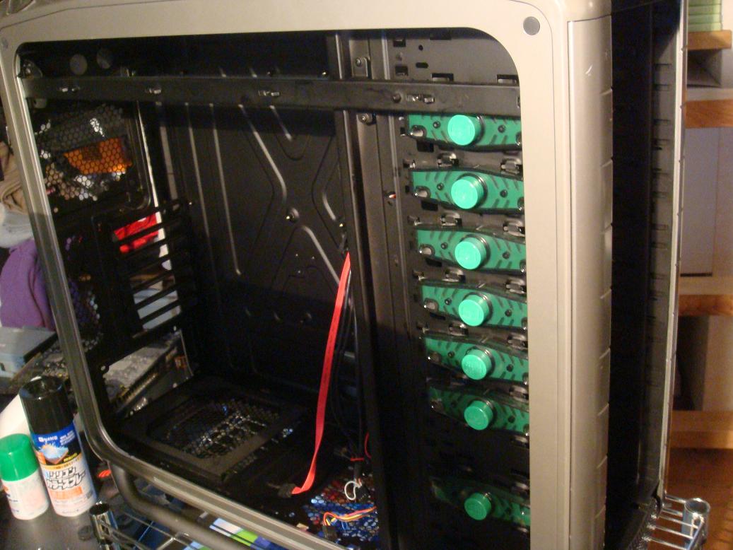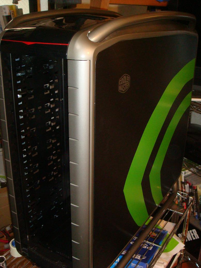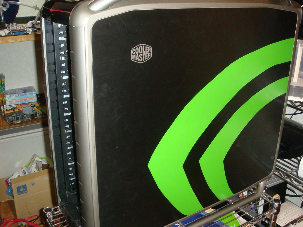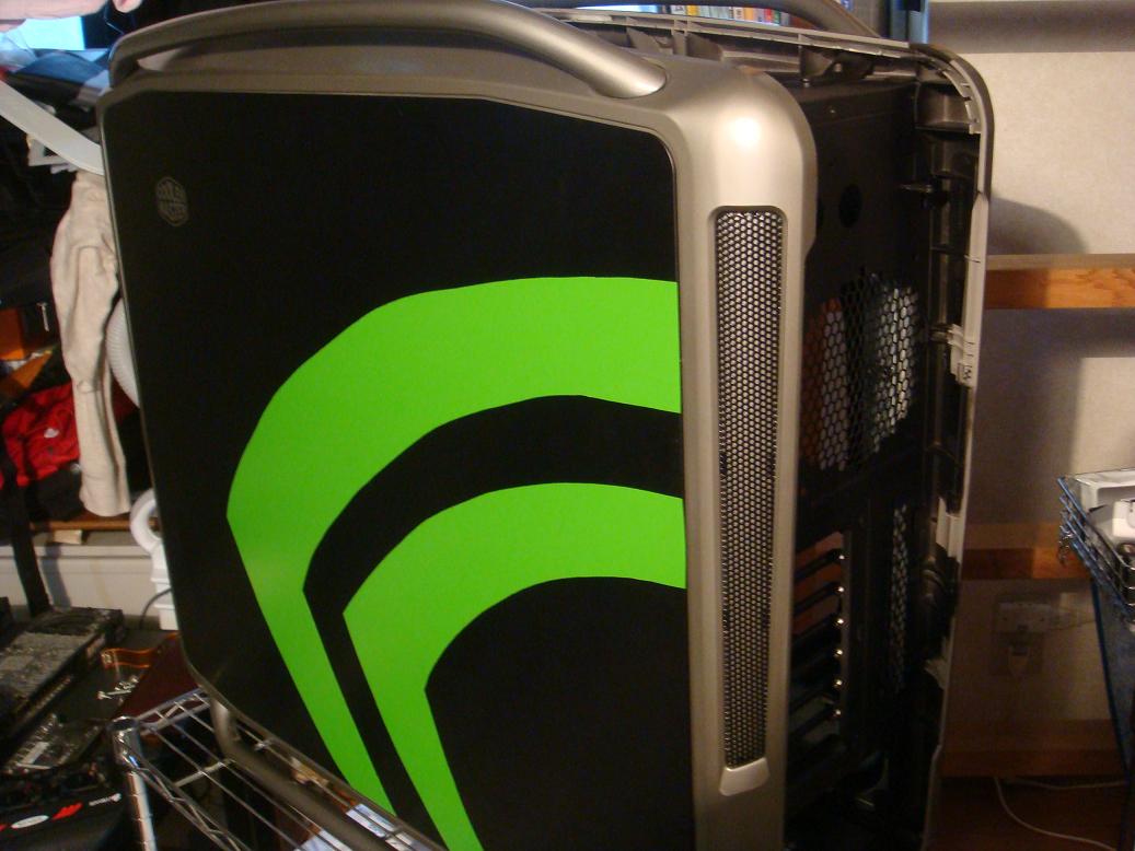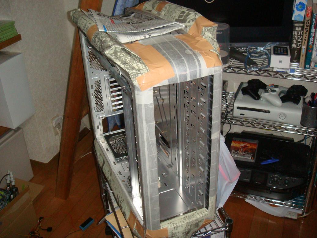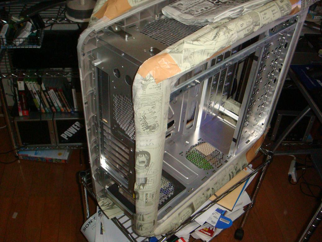 その際に使用したサイトはこちら http://www.stickam.jp/ 画質やレスポンスもそれなりで結構いい感じです。 ホントは身内のみのニコニコ生放送でやろうと思ったのですが 枠が開いてなくて1000人以上待っていたのでやめました笑 …話がそれましたが 昨日の深夜から実況した作業とは! ずばり COSMOS-Sのオリジナル塗装!! まずは本体を解体です。 ケースからすべてのパーツを外したのは約一年ぶりですねw 掃除も兼ねてます。 水冷のクーラント液が劣化していたので捨てました。 新しいクーラント液を買うまでは 水冷が動かせないのでi7はお休みです。 埃を取ったあとは マスキングをします。 余分な箇所に色が付くのを防ぎます。 ウチは新聞をとっていないので新聞がありません;; なぜか一部だけあったのですが これは床に敷く為に使うので 今回は泣く泣くジャンプを使いました。 ごめんねジャンプ…(;´Д`) このマスキング、開始したのは夜中の1時前。 終了したのは4時です笑 ホント夜中に何してるんですかねー 夜が明けて薄暗くなってきた頃 外に飛び出していよいよ塗装です。 そして子分らと喋っているうちに朝6時になり… 外に放置していたCOSMOSはだいぶ乾いていたので 家の中に回収しました。 盗まれたら涙目ですよねw 家に回収したあとは 完全に乾燥させるため放置して就寝^^ 7時に寝て 今日は10時に起きました。 3時間しか寝ていませんが 一応元気です^^ 朝起きたらマスキングテープをはがしてケース本体の塗装は終了です。 ヤバイ!!いい感じだwwwwww 若干ムラになっている箇所は 塗り残しがあったので後から塗装して乾燥していない部分です^^ そんなわけで今日はホームセンターに行って 緑色のスプレーと””ある物””を買ってまいりました^^ 帰宅して早速ボタン類の塗装に入りました。 これを乾燥させている間に 別の作業に移ります。 その作業とはこちらw 今日買ってきた””ある物””とはカッティングシートでした。 それをつかってこんなものを製作してみましたー^^ これを両面やっていたらあっという間に一時間が経ち… ボタンの様子を見に行ったら乾いていたのでケースに組み込みます。 自分で言うのもなんですが 結構近くで見るといい感じなんですよ笑 これでCOSMOS-S Ganeme's Edition @NVIDIAの完成です。 ↑名前なげぇw