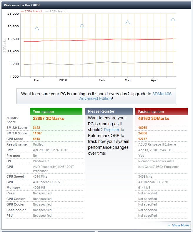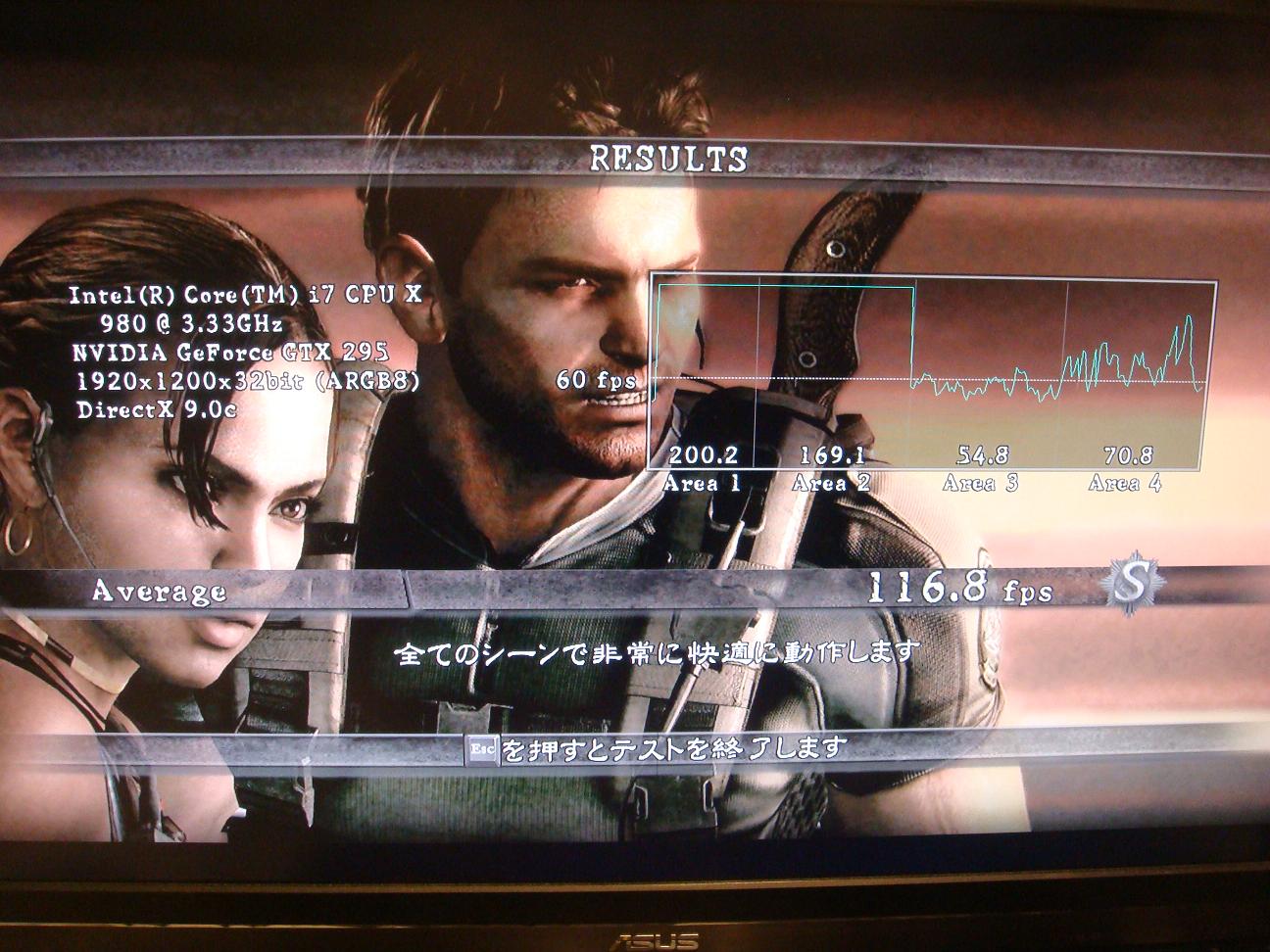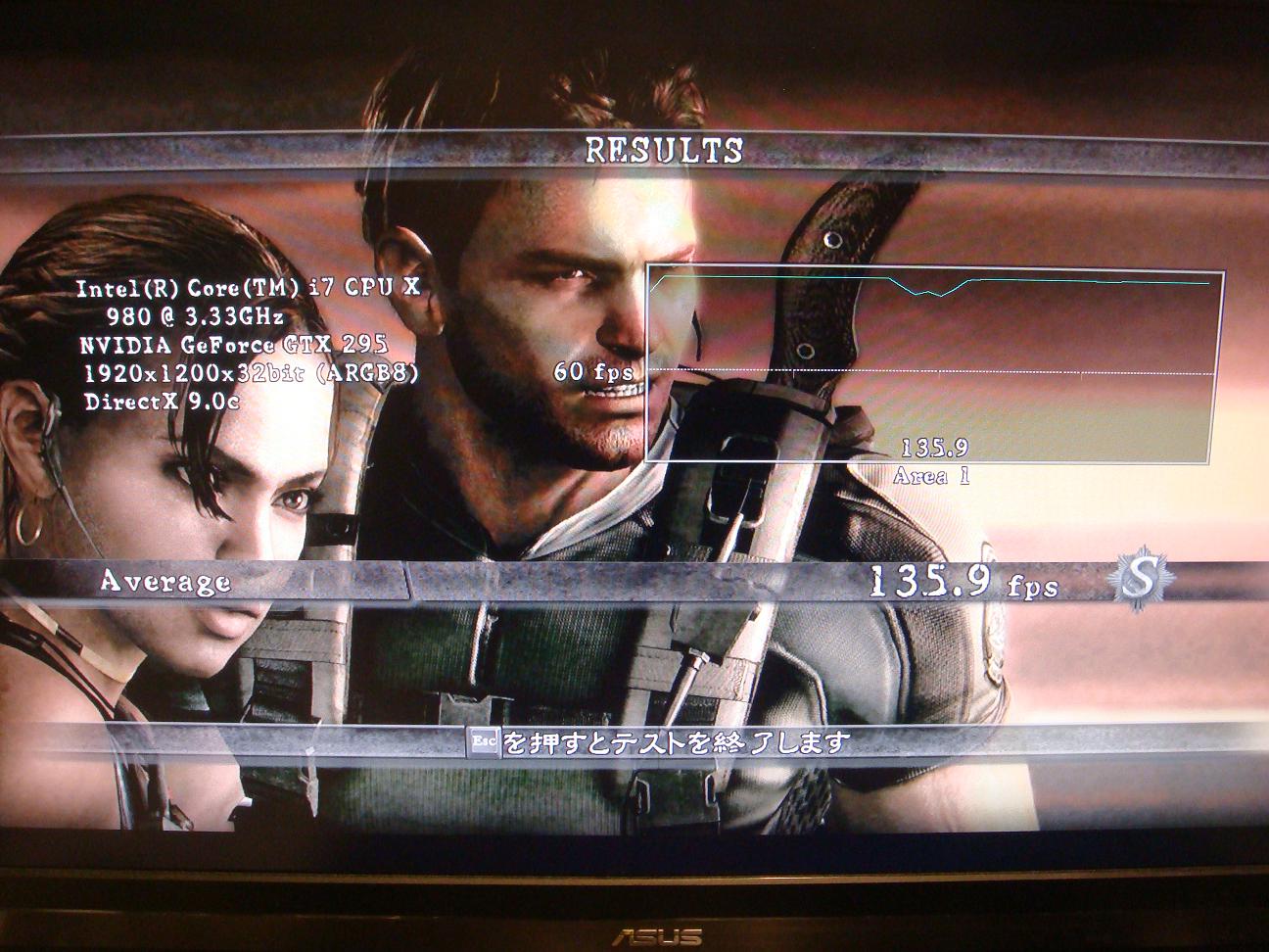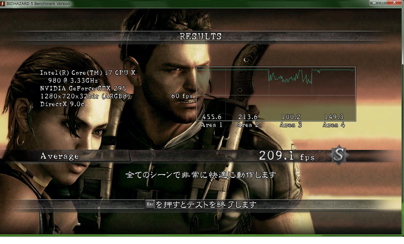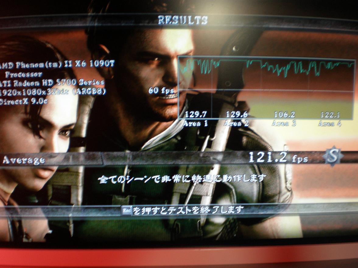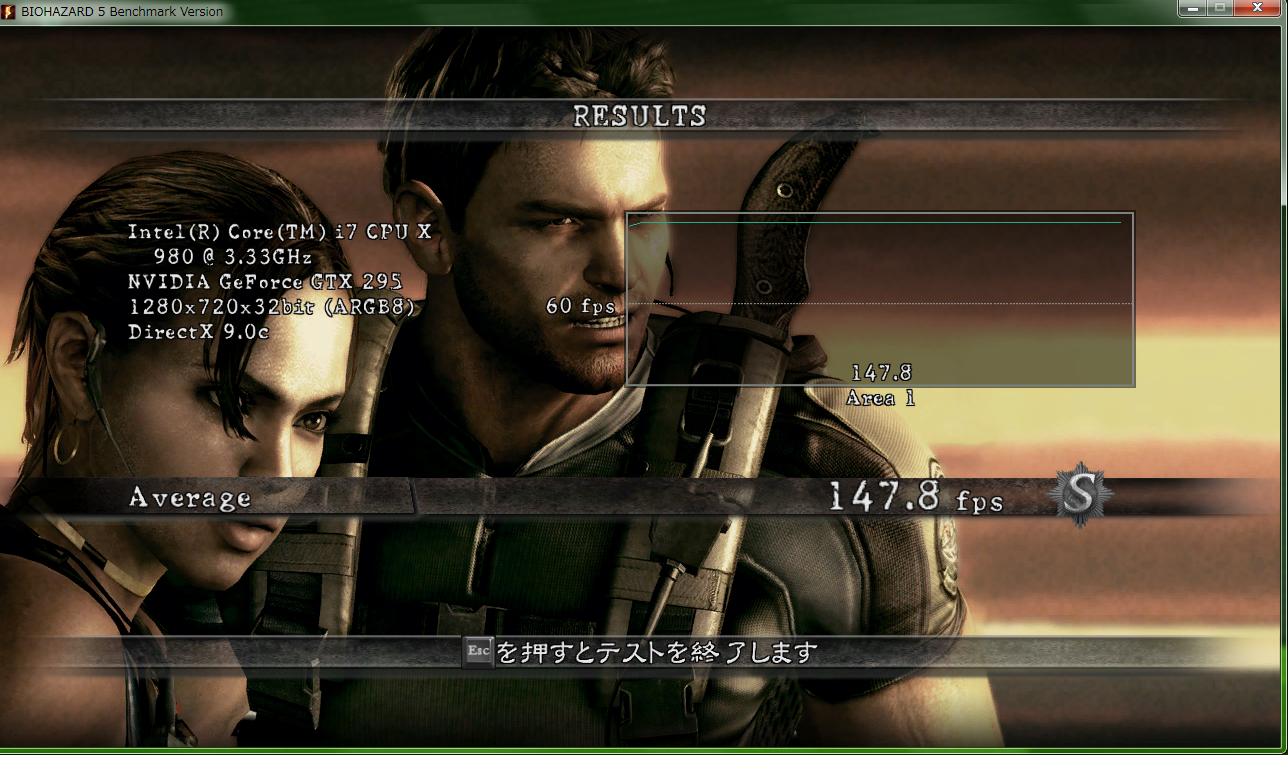 まずは今回検証に使ったマシン ■CPU :i7 980X ■ロット :3005F725 ■産地 :コスタリカ ■購入日、店舗 :新宿祖父 ■CPUFAN :水冷 ■電源 :ENERMAX REVOLUTION 85+ ERV1050EWT ■M/B :ASUS Rampage ⅡExtreme ■BIOS :1802 ■動作クロック :3337.8Mhz ■BCLK :133.5MHz ■CPU倍率 :25 ■QPI V :Auto ■Vcore :1.244v(BIOS-Auto) ■Vdimm :1.65V ■メモリ :Corsair CMG6GX3M3A2000C8 DominatorGT DDR3-2000 CL8 2GBx3@8-8-8-24-1T ■OS:Windows 7 Professional 64bit ■ケース:COSMOS-S ■GPU:GeForce GTX295 x2 QuadSLI ホントの初期状態です。 Hyper ThreadingはON Turbo BoostはOFFにしました。 メモリはタイミングと電圧のみメーカーの指定数値にあわせています。 まずはCINE Bench 11.5 ちなみにAMDから最近出た6コアCPU"PhenomⅡX6 1090T"では 3.2Ghzで5.66pts 4.02Ghzで6.99pts だそうで。 これは私の手下が1090Tを手に入れたので 比較の為に報告させて得た数値です。 彼がミスをしていない限り数値に間違いはないはずです笑 決して2chソースの情報ではありませんよ(*´ω`*) 次は3D Mark06 Bulid 1.2.0 Fastest SystemのマザーがRampage3Extremeになっていますね笑 とりあえずデフォルトなのでこんなもんでしょうか。 3D Mark06も手下のほうから1090Tの報告があるのでSSを貼っておきます。 これは CPU…PhenomⅡX6 1090T @ 4Ghz OS…Windows 7 Ultimate GPU...HD5770 x2 Crossfire での報告です。 次は3D Mark Vantage Build 1.0.2 余裕の3万越えです;; デフォルトでこれですからね( ^ω^)・・・ 温度のほうを取得するのを忘れていたのですが 後から図ってみたところ ※以下のリンクからReal Temp 3.40をDownload後解凍したフォルダの中のReal temp GTより測定 Real Temp ベンチ後の温度は40℃前後でした。 発熱は少ないようです。 これは先日追加したラジエータを増設する前に測定した結果です。 いろいろな方の報告を読む感じだと 4.5Ghzを越えるあたりから急に電圧を要求してくるので発熱量があがるみたいです。 ここら辺は後ほどOC編で語ることにします。 次はBIOHAZARD 5 設定は以下のようにしました。 スクリーン解像度-->1920x1200 画面モード-->フルスクリーン ディスプレイ周波数-->60Hz 垂直同期-->オフ フレームレート-->可変 アンチエイリアス--> 8X モーションブラー -->オン 残りの設定はすべて ”高” です。 これも手下より報告がありますのでSSを貼っておきます。 数値はほぼ一緒ですね。 なぜかAテストの後半は自分のマシンのグラフがgdgdになっています;; 理由は不明です(;´∀`) Bテストはグラフがほぼ平らなんですけどねー笑 このベンチの設定を初期でまわしたらどうなるんでしょ( ^ω^)・・・ というわけでまわしたのがこちら。 おぉぅ… てかBIOでもSS取れるんですねー フルスクリーンで実行しても結果が出てからAlt+Enterでウィンドウモードにすればいいらしいです。 手下に教えてもらいました^^ と、こんなもんでデフォルトクロックのレビュー終わり。 耐性とかはOC編で!