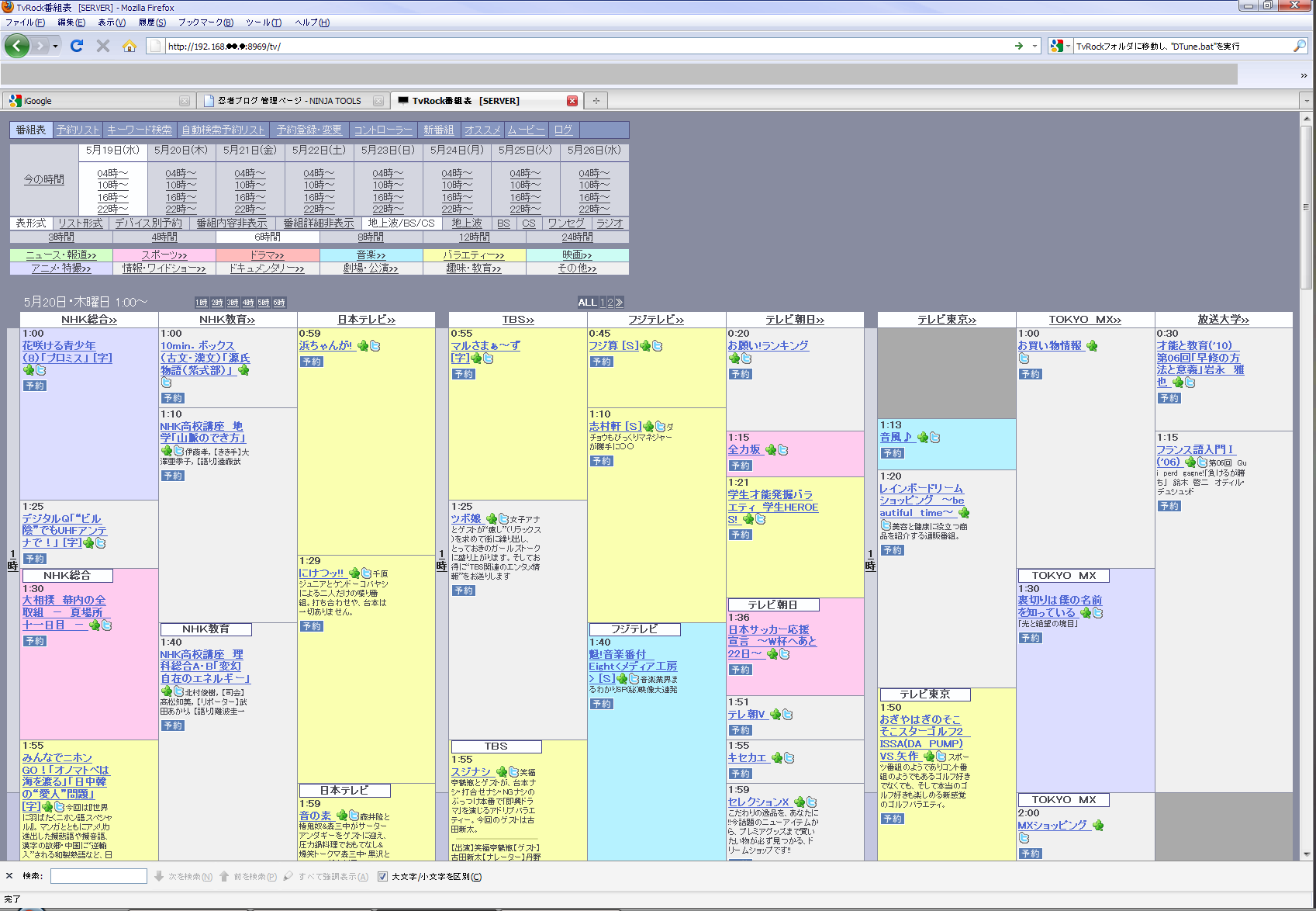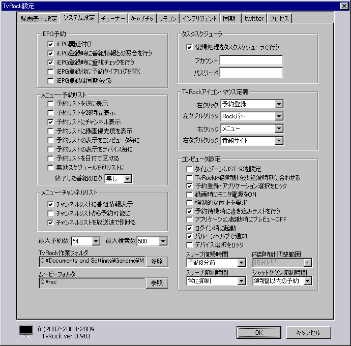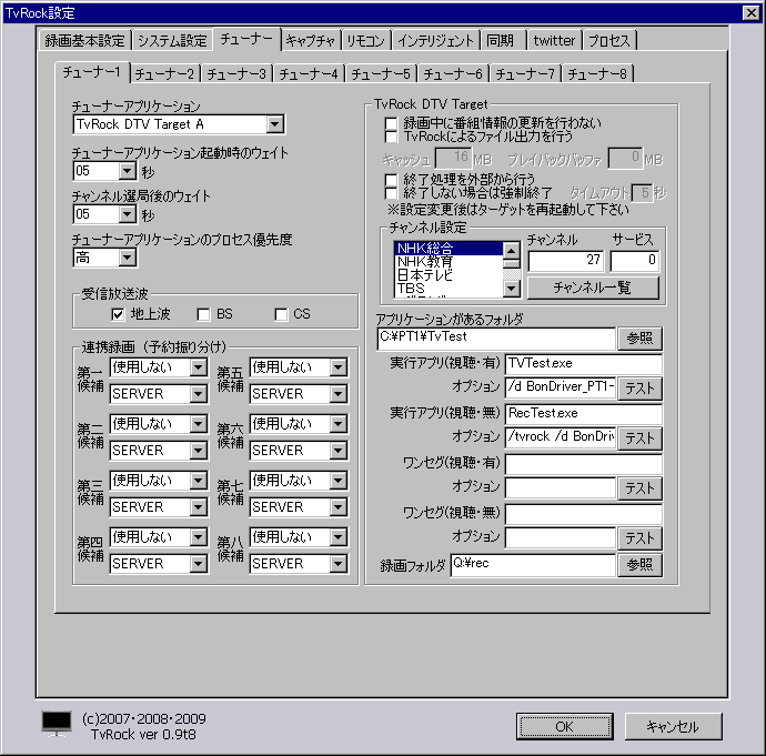 といっても有志の方が作ってくださっているものを 拝借するだけなのですが… 開発者の皆様ありがとうございます^^ もう既にPT1は生産終了になり PT2が巷では出回っています。 基本的にできることは違いがありませんが 細かい点では 1.チューナー毎のアナログフロントエンド(衛星と地上)の供給電源が個別に入切できるようになった。 2.チューナーモジュールを変更した影響で、衛星側のシリアルクロックが地上部に悪影響を 及ぼして CN が低下する問題が(ほぼ)解決されている。 の2点が改善されているようです。 PT2、今ならアキバで普通に買えるので買っちゃおうかなーって思ってたり…w まぁとりあえず現時点ではPT1しか持っていませんので 今回構築した録画環境の設定とかそこら辺をメモしておこうと思ってます。 今回の録画機の構成は 【CPU】intel Atom330 1.6Ghz 【Mem】バルク DDR2 800 2GB x1 【M/B】intel D945GCLF2 【VGA】OnBoard 【HDD】Seagate ST3750528AS 750GB 7200Rpm WesternDigital 1TB 7200rpm 【OS】WindowsXP Professional SP3 32bit 【CASE】AC150-IT81SB(Mini ATX) 【PS】AC150-IT81SB付属150W デュアルコアAtomになります。 OSはWindows XP Pro 32bit こいつ…実に非力です笑 ろくに動画も再生できないっていうww でも録画はPT1が頑張ってくれますので Atomでも十分運用できます!! このAtomはウチのファイルサーバも兼任させていますので 常時電源は付いています。 録画されたTSファイルは保存先をFTPサーバーのディレクトリにしてありますので LAN内からはWindows Networkからアクセス可能ですので 鑑賞の場合はそのまま再生し、エンコードする際にはメインマシンに転送して行います。 こういうときGigabitLANだと便利ですよ^^ WAN側からはFTPやらRDPやらVNCやらとまぁ色々とアクセスする手段はあります。 では導入手順をメモしておきます。 必要なもの ①PT1 or PT2(下のやり方ではPT2の人はできないかも…) ②カードリーダー ③B-CASカード ③に関しては自分でどうにかしてください…汗 ②は2k~3k位で買えます。 必要なソフト(必須) PT1ドライバ・ SDK Microsoft Visual C++ 2005 SP1 再頒布可能パッケージ (x86) GOM Player(コーデックが入れられればいいんです) 必要なソフト(選択) ※今回はTvRockというソフトをベースに使うことにしました。 TvRock Ver 0.9t8aを使いました TvRockOnTVTest 修正版4を使いました TVTest ver.0.5.24を使いました RecTest ver.0.1.8を使いました BonDriver_PT1-ST 人柱版5を使いました 最適化 まとめてパックLite(ICCビルド) 2009年01/28(水)04:01に投稿されているものです。 今回はCドライブ直下に"PT1"というディレクトリをつくり、その中にファイルを置いていきます。 C:\PT1\TvTest C:\PT1\TvRock こんな感じです。 ではファイルを設置していきます。 ①TVTestを解凍しC:\PT1\TvTestフォルダにファイルをコピー ②RecTestを解凍しC:\PT1\TvTestフォルダにファイルをコピー ③BonDriver_PT1を解凍しC:\PT1\TvTestフォルダにファイルをコピー ④TvRockOnTVTestをC:\PT1\TvTest\TvTest\Pluginフォルダにコピー ⑤TvRockを解凍しC:\PT1\TvRockフォルダにファイルをコピー ⑥TvRockに移動し、"DTune.bat"を実行 各種設定をしていきます。 ①使用するTvRockDTVターゲットの数を選択してください。 PT1は4チャンネル(地デジx2 BS/CSx2)なのでフルに使う場合には4チューナーですが 私は地デジしかみないので2チューナーにしました。 ② 視聴・録画アプリケーションがあるフォルダ C:\PT1\TvTest チューナータイプ 地上波デジタル 実行アプリ名(視聴用) TvTest.exe オプション /d BonDriver_PT1_T.dll /DID A 実行アプリ名(録画用) RecTest.exe オプション /TvRock /d BonDriver_PT1_T.dll /DID A 録画先フォルダ指定 なるべく大容量のHDDを指定したほうが良いです。 すべて入力し終えたら”次へ”をクリックします。 設定が表示されますので特に何もせず"次へ"をクリックします。 チャンネルの設定画面がでますので 視聴地域チャンネル一覧をクリックして 都道府県と地域を選択して このチャンネルを設定 をクリックします。 あとは番組表が取得されるまで30分程度放置します。 これが完了したら 最適化まとめてパックを解凍して BonDriver_PT1-ST-shm\ATOM の中身を C:\PT1\TvTest フォルダにファイルをコピー RecTest の中身を C:\PT1\TvTest フォルダにファイルをコピー これで完成です(*´ω`*) デスクトップにTvRockのショートカットをつくっておけば良いでしょう。 Windowsのスタートアップに自動で登録されるのでどちらでもかまいませんが…(;・∀・) 左下の4つのボタンで操作します。 左から順に 視聴用画面の表示 録画開始 録画停止 SS撮影 となってます。 まだ導入して一日なので設定はあまりしていませんが 軽くメモしておきます タスクバーの右下のTvRockのアイコンを右クリックして設定をクリック 左下の作業フォルダとムービーフォルダを変更しました。 右下の録画フォルダをここで改めて録画先に指定します ここをきちんと設定すれば 外部から番組表を使って録画予約ができます。 ***は連動しています。 録画機自体からは http://localhost:8969/***/でアクセスできますし LAN内の別のクライアントからは http://録画機