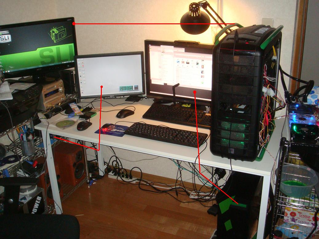 そして右のモニターがサブ機と接続されていて