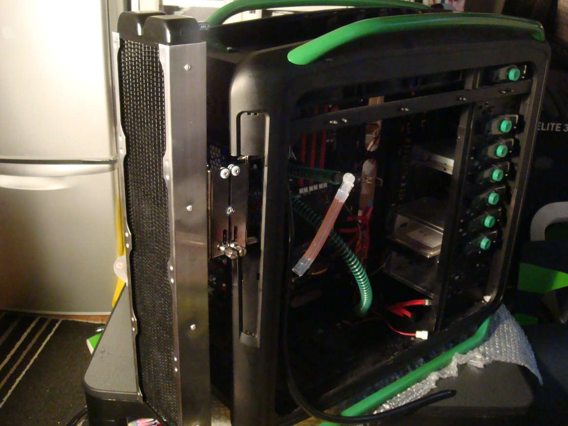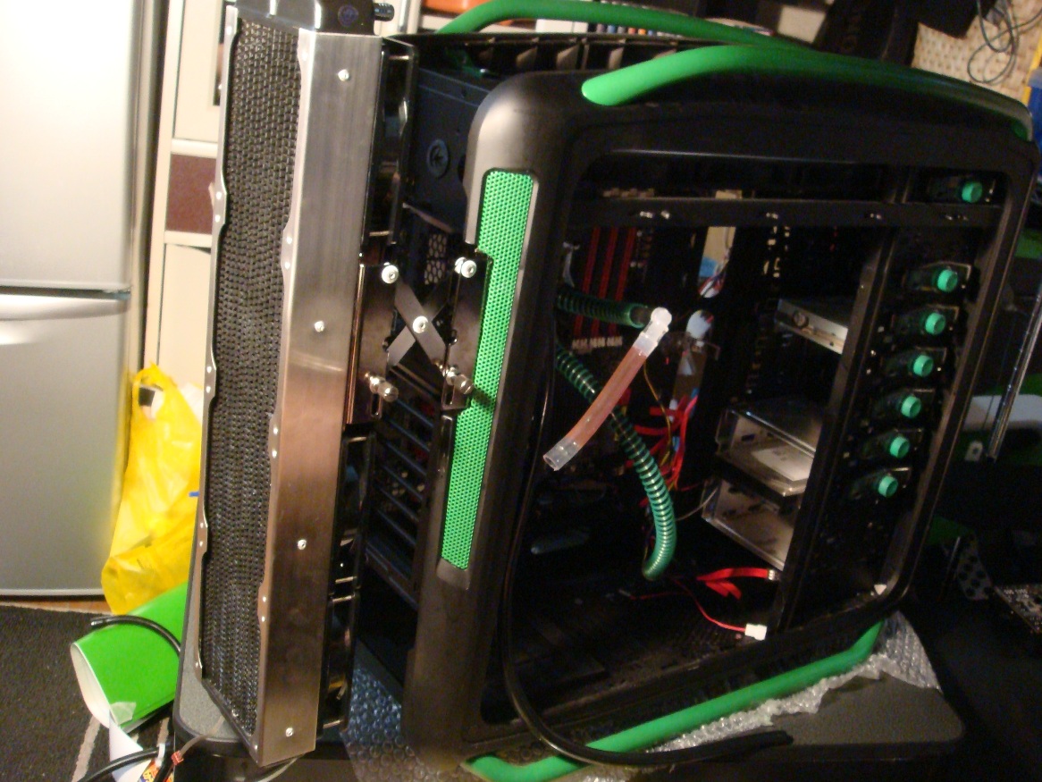 初めはOCGPに出すためにやったのですが 途中から完全に目的を見失っていたというか ただ単に作業自体が面白かったというか… …まぁとにかく!! 第二弾が始まります!!! 詳細はまだへたれくそ大根にしか言っていませんが 今週末までにはお知らせできると思います。 第二弾の第一段階として(ややこしいなw 今日は今までケースの横の台に裸で置きっぱなしになっていた ラジエータの480Sをケースとくっつける作業をしました。 その際に注文したパーツがこれ! KOOLANCE BKT-HX001 12cm x4サイズまで対応しているので 480Sもギリギリで取り付け可能とのことなので購入してみました。 まぁ結論から言うと… COSMOS-Sには装着不可!! このケースは背面が少々奥に引っ込んでいるため 側面のパネルと干渉してしまい、装着することすらできませんでした。 しかしこんなことで7000円の買い物をあきらめるわけにもいきません。 そこで悩むこと数秒… … … 入んないならケースぶった切ればよくね? ガネさんぱねぇっすwwwww というわけで、即決でした。 本格DIYってやつですかね笑 というわけでこんな感じにぶった切ってやりました。 ※このあとちゃんと綺麗にヤスリをかけてから同色で塗装しました。 興奮していたので途中の写真を撮るのを忘れていましたが 完成はこんな感じになりましたー 最後にこれを付けて取り付け完成です! 細かいところは後々修正していきたいと思いますが まぁ突貫工事にしてはなかなかの仕上がりではないでしょーか。 ちなみに480Sには4つファンが付けられますが 1スロットは取り付け具によって使われてしまうので 実質3つしかファンはつけられません。 今回はCoolerMasterの緑LED付2000rpmのものを3つ付けてみました。 第二段階は今週の金曜日か土曜日あたりに公開できる予定です。