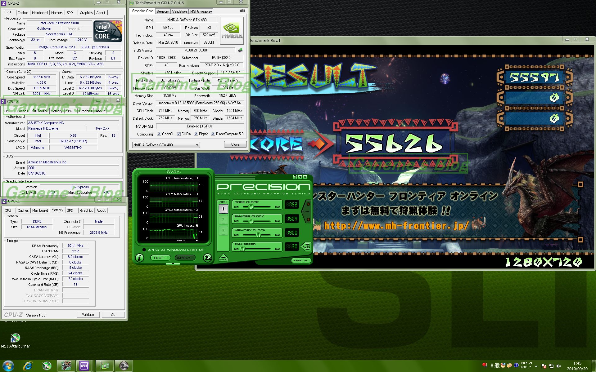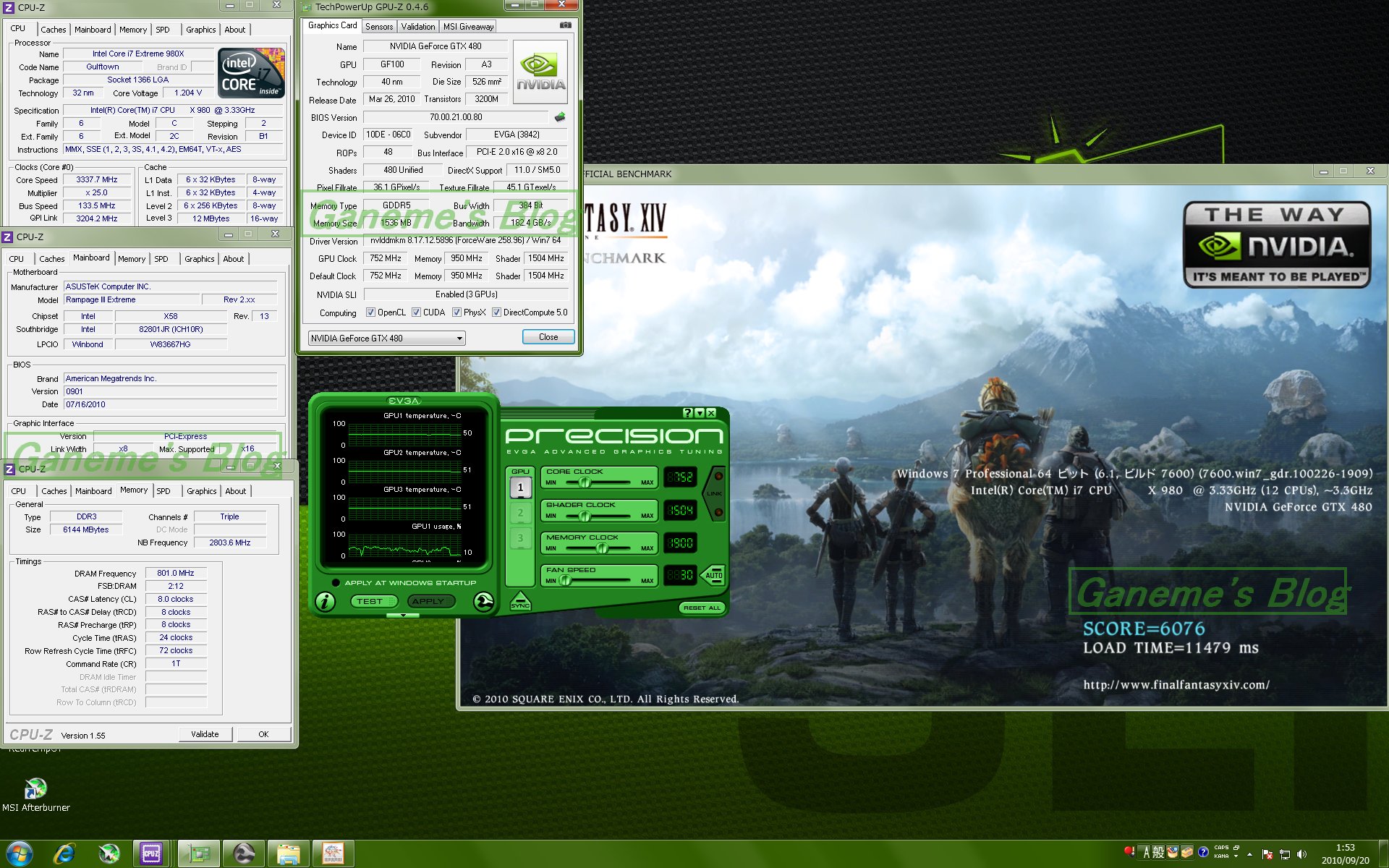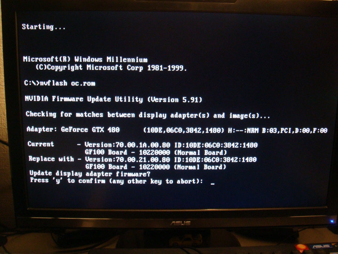 アイドル時39℃! 負荷時でも60℃を超えることはありませんでした! 水冷恐ろしい子!! これはとてつもないマージンを手に入れられました。 その上GTX480の爆音ファンを撤去できたので 前よりは! 前よりは静かになりました。 ※大事なことなので2回言いました。 私が使っているモデルは EVGAの通常版のGTX480ですが EVGAは実はGTX480を3モデルリリースしています。 ①通常版 Core : 700Mhz Memory : 1848Mhz Shader : 1400Mhz 【BIOSリリース】 70.00.1A.00.80 70.00.1A.00.80 ~1 70.00.21.00.80 ←Newest ②SuperClocked版 Core : 726Mhz Memory : 1900Mhz Shader : 1452Mhz 【BIOSリリース】 70.00.1A.00.82 70.00.21.00.82 70.00.21.00.84 ←Newest ③Hydro Copper FTW版 Core : 752Mhz Memory : 1900Mhz Shader : 1504Mhz 【BIOSリリース】 70.00.1A.00.82 ←Newest こんな感じであるわけですよ。 せっかく水冷にしたのだから ③のHydro Copper FTW版と同じ仕様にしたいじゃないですか。 というわけで前置きが長くなりましたが BIOSの書き換えを決行しました。 今回は初めに入っていたBIOSが初期の70.00.1A.00.80だった為 最新版のBIOSに更新しつつもFTWと同じ仕様にカスタマイズして入れてみました。 今回はCPUはデフォルトクロック! メモリは超ゆるゆるで GPUのみって感じです。 SS撮るのを忘れたのですが FF14ベンチ Highでは6500程度と Low と Highが逆転するという面白い事象が…ww とりあえずやり方はメモしておこうと思います。 下記の方法はフロッピーディスクがない人向けです。 【GPU BIOS 書き換え手順】 用意するもの ・32bit OS ・USBメモリ ・書き換えたいNvidia系GPU 用意するソフト ・NiBiTor ・nvflash ・HP USB Disk Storage Format Tool ・Virtual Floppy Drive ソフトウェアはこちらに現状最新版のものをまとめておきました。 ①Virtual Floppy Driveを起動して"インストール"をクリック→"開始"をクリック ②"ドライブ0"というタブをクリックしてドライブ文字という 項目の”変更”をクリックして適当なアルファベットを指定する。 ③"開く/新規"をクリックしてそのまま何もせず”OKをクリック ※イメージのアドレス欄は空欄でOK ④VFDコントロールパネルを開いたまま"マイコンピュータ"を開いて②で指定したドライブ文字のドライブを 右クリックして"フォーマット"をクリックする。 ⑤”MS-DOSの起動ディスクを作成する”にチェックをいれて開始をクリック ※このときUSBメモリの中身は消去されるので注意 ⑥HP USB Disk Storage Format Toolをインストールする。 ⑦インストールが完了したら起動して一番上の項目が自分が刺したUSBメモリであることを確認する。 ⑧ファイルシステムは FAT32 にして、”Quick Format” "Create a DOS startup disk" の二つにチェックをいれて using DOS system files located at の下のアドレス欄に先ほど②で 指定したアルファベットのドライブパスを指定して Start をクリックする。 ⑨Format completed successfullyと表示されて以下の画面が出たらこのツールを閉じる。 ⑩VFDコントロールパネルは"ドライバ"タブの停止をクリックしてからアンインストールをクリックして から終了させる。 ⑪USBメモリにnvflashの中身(nvflash.exeとCWSDPMI.EXE)を入れる。 ⑫NiBiTorを起動します。 ⑬まずは初期状態のBIOSを取得しますのでFile→Save BIOSで保存してください。 例 Normal.rom などと名前を付けてUSBメモリにおいてください。 ⑭適当にBIOSの値をいじります。 ※この場合の適当というのはそのGPUにあった値にそれぞれ合わせてくださいってことです。 ※壊れても責任は負いません。自己責任でお願いします。 ⑮File→Save BIOSでわかりやすい名前にしてUSBメモリに保存してください。 例:oc.rom など ⑯一度Windowsを再起動してBIOSから ブートドライブをUSBメモリから起動する設定にします。 -----------------------WARNING---------------------------- この時SLIなどマルチGPU構成を組んでいる方は一枚のみの構成にしてください。 エラーになるかもしれません。 ------------------------------------------------------------------- ⑰USBから起動したらnvflash oc.rom とコマンドを打ちます。 ※oc.romの部分は自分で先ほどいじってから保存したBIOS名にします。 ⑱ " y " を押したら書き換えが始まります。 これで終了ですー ふぅ…長かったw