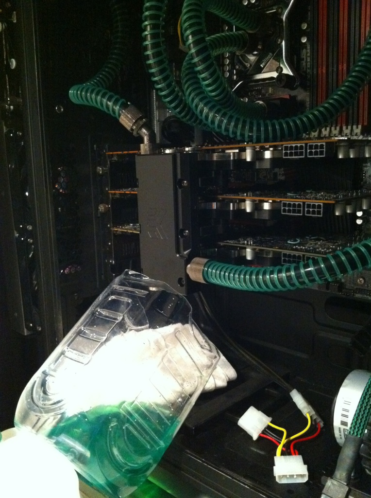 これでいよいよメインマシンが動かせる!! と思ってwktkしながら帰宅。 そのまま水路を組み、ランニングテストをしようと思い TPQ-1200-OCとAX-1200をみたのだが ケーブルが着脱できるAX-1200で動作させようと思って AXの24pinに"パソコンに直接繋がなくても電源ユニットを起動できる基盤"を取り付けて ONにしようとしたところ… 電源が起動しないwwwwww 実は到着したのは31日だが パーツが揃っていなかったので放置していたのだ。 どこをどうやっても電源は動かず… 結局初期不良という結論に… 海外通販の初期不良とか一番厄介;; とりあえずAmazonに送って交換してもらうか Corsairに送って修理してもらうか のどちらかをやるのは確実ですが 送料が…(ry 輸入代理店に連絡をして Corsairにもメールで連絡をしたので 両者からの返答次第で決めようと思います。 こんなことならおとなしく国内版買うんだった… まぁ…こんなわけでAX-1200は現在ゴミなので TPQ-1200で仮組みして水路のランニングテストをしました。 今回は一発OKでしたw 今回はLaing社のD-5というポンプを新しく導入し、流量をアップさせたので 冷却効果も期待できます。 グリスも変えたしね。 水温系も追加したので水温も計れるようになりました^^ ランニングテストを終え、とりあえずベンチでも久々に回してみるかー ってことでBIOS画面に入ったのですが そこで違和感というか明らかな問題が… メモリが4GB分しか認識されていない!!!!!! 6GB分積んでいるはずなのでこれはおかしい!! ってことでメモリスロットの位置を変えたり 差し込む順番を変えたりといろいろと試行錯誤してみたのですが 結局認識されず…orz 順番に確認していったところ メモリ側は異常なし! マザーの3番スロットが死んでいました… あぁああああぁぁgyふじこlpll;@;p@; もうこの時点で朝4時 この状況で萎えない人などいないはず。 朝の4時から現実逃避して イカちゃんに癒してもらったっていうね。 Rampage3Extremeは国内代理店を通しているので 保証もまだあります! とりあえず先方には連絡してあるので 連絡待ちの状態です。 空冷ならいくらでもばらすんだけど… ウチは見た目重視だからシャットオフバルブとか入れてないから 水抜くのがたいへんなんだよおぉおおおおおおおおおおお 水路を一度組んだのに3時間もしないうちに解体することになるとは… 実はこの水路… 研究所のメンバーからのアドバイス受けて いろいろ考慮された設計になっているというのに… 数時間でこれです 悲しすぎるwwwwwwwwww とりあえず心の中にある文句は全てぶちまけたので これからコンビニにジャンプコミックス買いに行って それ読んで寝ます。 とりあえずこの記事を読んでくれた方! 励ましのコメント待ってます。 今真剣にへこんでいるので立ち直れないかもしれません…orz 皆様の暖かい声援がGanemeの活力になります笑 はぁ…