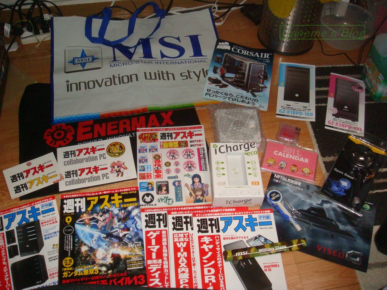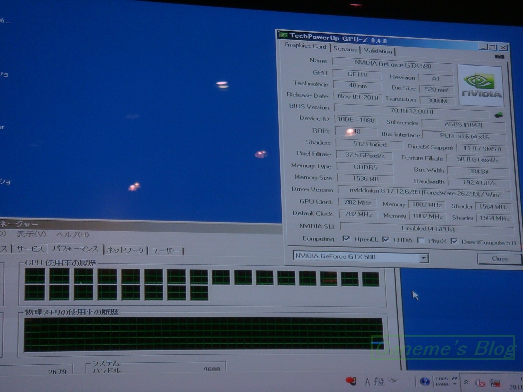 とりあえず今日のメインの目的はリンクス感謝祭だったのですが 駅からリナカフェに行くルートの途中に週アスLIVEの会場があるので 途中そこに立ち寄ってグッズを捕獲してからリナカフェに向かいました。 今回は週アスのほうはイベントの情報等まったく事前にチェックしていなかったので アンケートに答えたりするだけでした。 めぼしいグッズも特になかったのですが ステッカーが手に入ったのが良かったかな?w でも一番良かったのは 生のベーコン小林が見れたことwwwwww 俺あの人の隠れファンなんだよねww と、少し感動しつつリナカフェに向かいました。 今日のリンクス感謝祭のプレゼンは GIGABYTEとLUXA2以外全て出席してきました!!! くじ引きにもほぼ参加! なんという暇人wwww ほぼ一日リナカフェにいたっていうどうしようもないヤツです。 iPhoneでTwitterを酷使してくじ引き券をGETしておりました。 一枚も当たりませんでしたけど! 個人的にはCorsairとMSIと もちろんNVIDIAのプレゼンが興味深い内容でしたな。 MSIのプレゼンの時なんかP67の未発表マザーまで見せる始末…笑 NVIDIAのプレゼンはもちろんGTX580!!! そしてもちろん!! NVIDIAのプレゼンとduckさんのOCチャレンジは 最前列に陣取っておりました 席の確保は毎日学食で鍛えられてるしね。 ← そのおかげなのか自分の席のすぐ左側ではこんなことが… なんというか… 漢のロマンが詰まってますよね NVIDIAのプレゼンのあとがduckさんのチャレンジだったので 急ピッチで準備が進められていたのですが… 結局開始時刻までには間に合わず 少々遅れてのスタートとなりましたが 最前列に陣取っていた自分の目の前には 衝撃的な光景が広がっていました。 AX-1200が4台ってなんだよwww なんかもう凄いとしか言いようがないです。 そしてこれも… なんぞこれwww これが噂の12コア24スレッドか… おまけにGTX580 4waySLIときたもんだ もうこの時点でよだれが出そうなシステムだw 夕方5時20分からduckさんのやつが始まったのだが システムトラブル(マザーに異物が挟まったりVantageが召されたりアスペクト問題など…etc) によってイベントにしては長期戦になってしまった。 終わったのは夜9時半を軽く過ぎていただろう。 自分はもちろん最後までいたのだが 夕方の時点では店からあふれていた観客も1/6程度になっていた。 まぁ当然か。 好きなやつしか残らんわなw というわけでアキバで軽くご飯を食べてから帰宅したので 到着したのは11時過ぎ 新宿駅に着いた時にはiPhoneは召され、G9もほぼ召されていて 生きているデジタル機器はPSPだけだったっていうね。 ネットジャンキーな自分としてはありえない状況ではあったが なんとか狛江研究所に帰還することができた。 最後に 今日GETしたアイテムを晒して終わろうと思う。 リンクス感謝祭では リンクス製品のレシートを持っていくと 福引ができたので、自分はリナカフェで売っていた iChargeというモバイル用バッテリーを買って一度福引をやってみた。 色はいろいろあったのだがもちろん緑である。 NVIDIAを愛するが故である。 これの裏側には太陽電池も付いているが 全然期待してないwwww 普通にUSBやACアダプタから充電できるのでね。 まぁ福引は当然当たらなかったが、残念賞が結構良かったので満足^^ iPadのケースとかAntecのSpot coolとか他にもいろいろあった。 自分はAntecのSpot coolにした。 iChargeは1500円だったのでまぁ総合的に見て悪くはないと思う。 以上 報告終了! 追記----------------------------------------------------- 最近こんなの買ってみました笑 机周りはこんな感じになってます。 デスクトップ画面には触れないでください。 いろんな意味で…汗