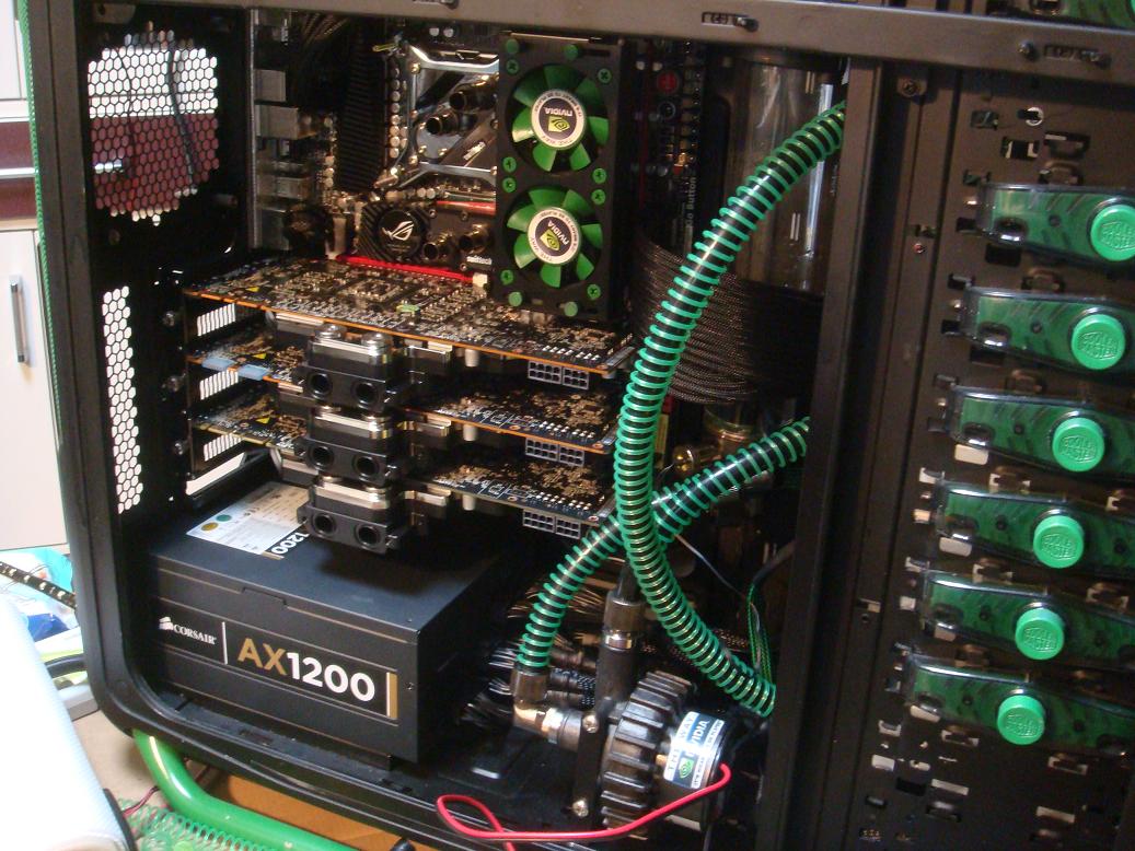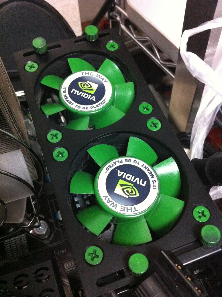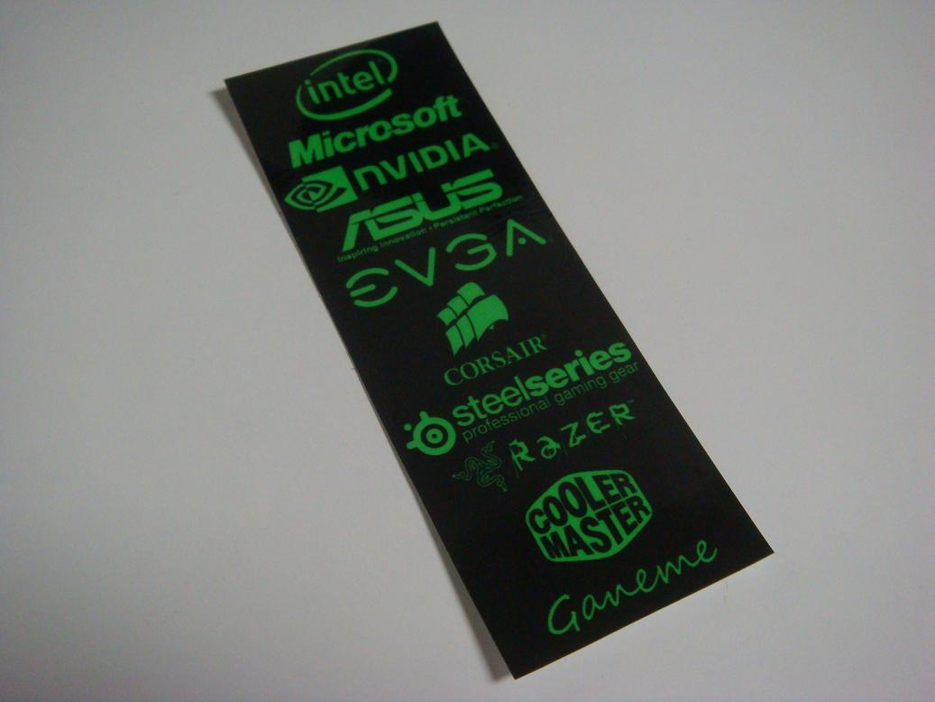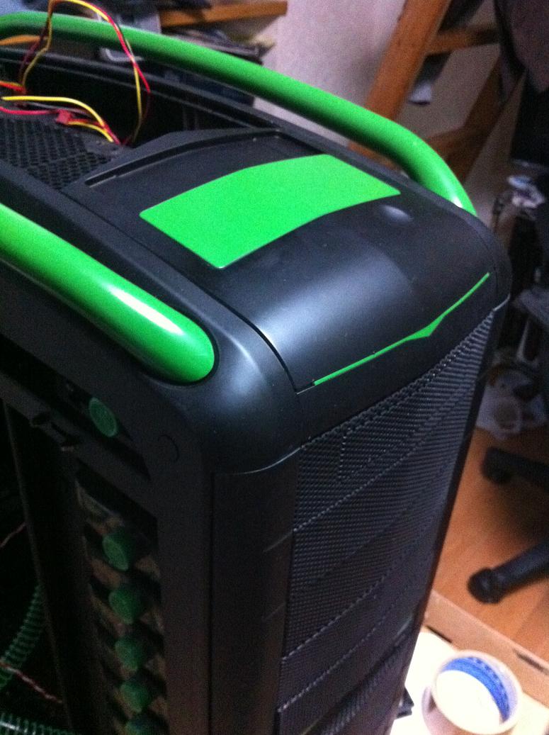 ~製作風景~ ~完成品~ 前モデルからの変更点は ・GTX580 3way SLIになったこと ・Green LEDを大量投入したこと ・COSMOS-Sのフロント部分の赤かった部分を緑に塗装して完全に黒X緑カラーに ・若干の塗装やりなおし ・電源がCorsair AX-1200になったこと ってところですね。 会場に搬入する前日には GPUのフィッティング部分にこのステッカーを自作して貼りつけておきました。 このPCに採用しているパーツメーカーのロゴ達です^^ 下にはちゃっかり自分のサインも笑 このPC…急遽年明け1月前半くらいまで(終了時期未定) 秋葉原のFaithにて展示されることになりましたので 是非直接ご覧になってみたい方はFaithまで!!