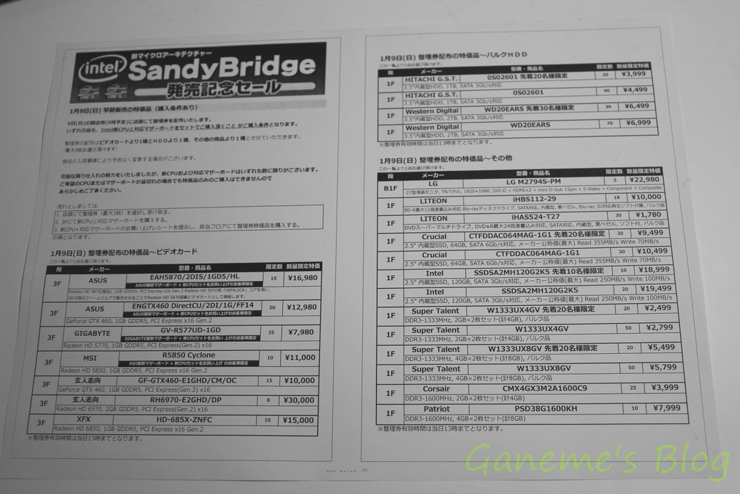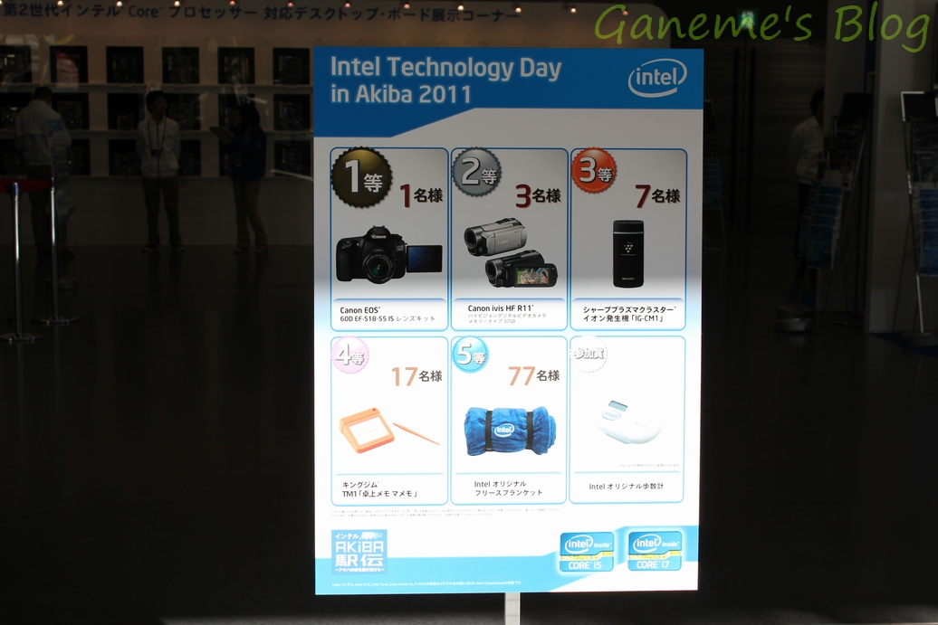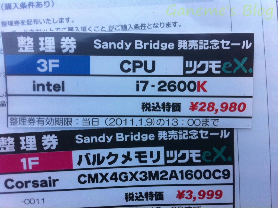 アキバに移動したあとはすぐに目的地のTsukumo ex.へ向かいました。 SofmapやほかのTsukumo店舗でも早朝販売が行われたようですが なぜTsukumoにしたのかというと、単純に2600Kの在庫が多そうだったからです。 昨日Twitterで在庫の画像が出ていましたので、それで判断しました。 自分が着いたのは6時前だったのですが、すでに20人~30人が並んでいました。 列の最後尾に並んで、早速iPhoneでつぶやこうとしたら… iPhone4電池切れwwwwwwww auのガラケーも電池1/3wwwww これから3時間も並ぶというのに あまりにも拙い装備… おまけに今日は早朝販売に参戦するつもりではなかったので 防寒装備が薄い長袖+セーター+Pコートの3枚重ねだけ;; マフラーがあったのがせめてもの救いでした。 それでも寒いので体を振動させつつPSPで遊んでました。 まぁ最終的に相当な長さの列になったようですが… バッチリ整理券を確保!! 整理券配布前にSandy CPU購入者限定の特価品一覧表が渡されました。 パッと見た感じでは欲しいものが見当たりませんでしたので スルーしようかとも思いましたが、一応Corsairの安いメモリの券だけ貰っておきました。 まぁ最終的には無事マザーもお目当てのものが買えましたので万々歳でしたー^^ Tsukumoを出て、各店を徘徊し始めたところ ベルサール秋葉原でintelがイベントをしていましたので覗いてきました。 もちろん今日発売のSandy Bridgeに関するイベントです。 スタンプラリーもやってました。商品は下の画像です。 会場にはLGA1155のマザーがずらりと展示されていました。 また、i7 2600Kとi7 870の比較デモがこのケースで行われていました。 CoolerMasterのCM690Ⅱのカスタム品ですねー 動画のエンコードデモでは、2600Kが870の2.5倍くらいの速度でエンコしてました。 こりゃ速いわww ステージイベントは最初のほうしか見ませんでしたが アメリカからintelの副社長?が来たり、書初めのパフォーマンスが行われました。 この"速"は"speed"というアルファベットで構成されています。 最初は何を書いているのかさっぱりわかりませんでしたが、書き終わったあとに解説されると なるほどなぁーーーーーって感じになりました(*´∀`*) この時点で完全にモバイル端末たちは息絶えていましたので さっさと撤収してきました。 最後に今日IYHしてきたヤツらを紹介して終わりたいと思います。 Core i7 2600K ASUS P8P67 Deluxe Corsair CMX4GX3M2A1600C9 Corsair CMT6GX3M3A2000C8 ホントはGが欲しかったんだけどね;; スタンプラリーの参加賞 intelロゴ入りの万歩計 つくもたん!!!!!!!!!!!!!! また今年もこの娘に金品を搾取される日々が始まるのか…orz これから出かけるので、夜帰ってきてから早速組んでみたいと思います。