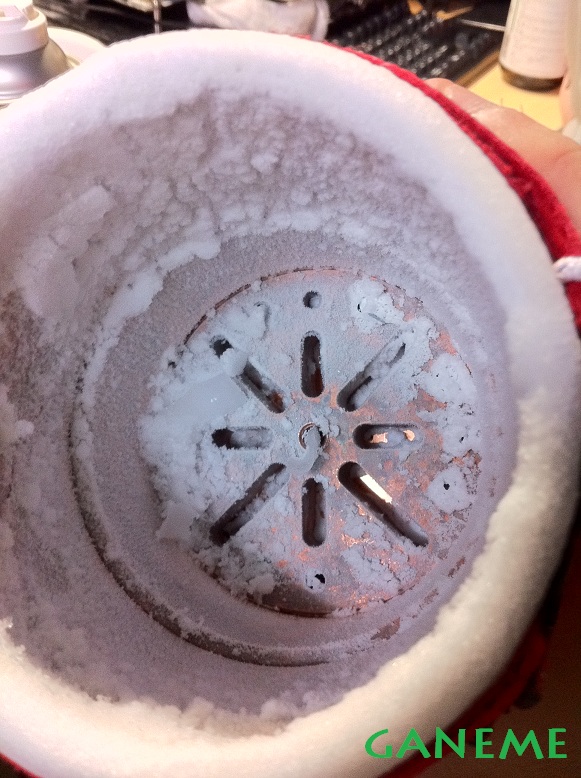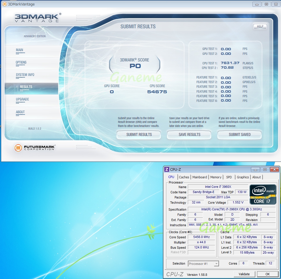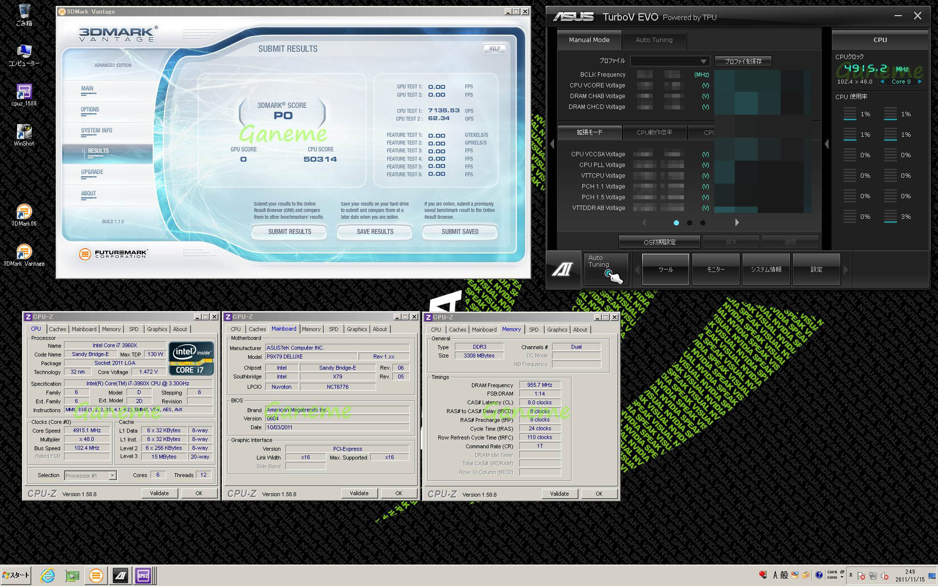 まずは空冷で試してみた。 空冷環境 【CPU】Core i7 3960X 【M/B】P9X79DELUXE 【RAM】TR3X6G2000C8GT 2枚 【GPU】GeForce8600GT 【SSD】C300 64GB 【PSU】ST-1200G 【CASE】V-TEC ARC Bed Professional Rev11.0 VantageのCPUテストが通ったら良いこととした。 途中経過① まだ全然電圧かけてなくてもこれくらいでVantageをパスできた。 熱的にもまだ若干余裕があるからもう少し行けるかと。 SS取得を忘れたのだが 最終的に空冷では5178MhzでVantageを通すことができた。 もちろんPhysXはOFFである。 もっとも8600GTなのでONにしてもOFFにしても大差はない。 次に水冷のステップをぶっとばして 液体窒素環境でテストを行った。 LN2環境 【CPU】Core i7 3960X 【M/B】SABERTOOTH X79 【RAM】すごいやつ4枚 【GPU】GeForce8600GT 【PSU】AX1200 【CASE】Sledge Hummer table 【POT】Xtremeな奴 クロックを上げるにあたって2つの攻め方があって 初めは片方の攻め方だとどうやっても起動しなかったり 倍率がおかしくなったりしたのだが、冷やしているうちに 適正な電圧がわかってきたので結果的に無事動かすことができた。 まだほんの少しだけ電圧マージンが残っているので そこに期待したいところではある。 目標は54倍以下で5500Mhzオーバーだ。 久々にLN2使ったけど冷たいなww(当たり前だけど 上のSSは一つ目の攻め方で合わせたクロックだが 二つ目の攻め方で同じくらいに合わせたクロックでもVantageをまわした。 ベンチは通ったのだがSS取得時に失敗してしまったため 携帯カメラで撮影したスコアがこれだ。 あー惜しかったなー;; クロックとしてはこちらのほうが若干上である。 でも空冷で5200、窒素で冷やしても5500くらいまでしかいかないなんて…() 窒素で冷やすのは楽しい。 まぁガルフの時のほうが個人的には面白かったかなーとは思うけど。 関連リンク http://ganemepc.blog.shinobi.jp/Entry/469/