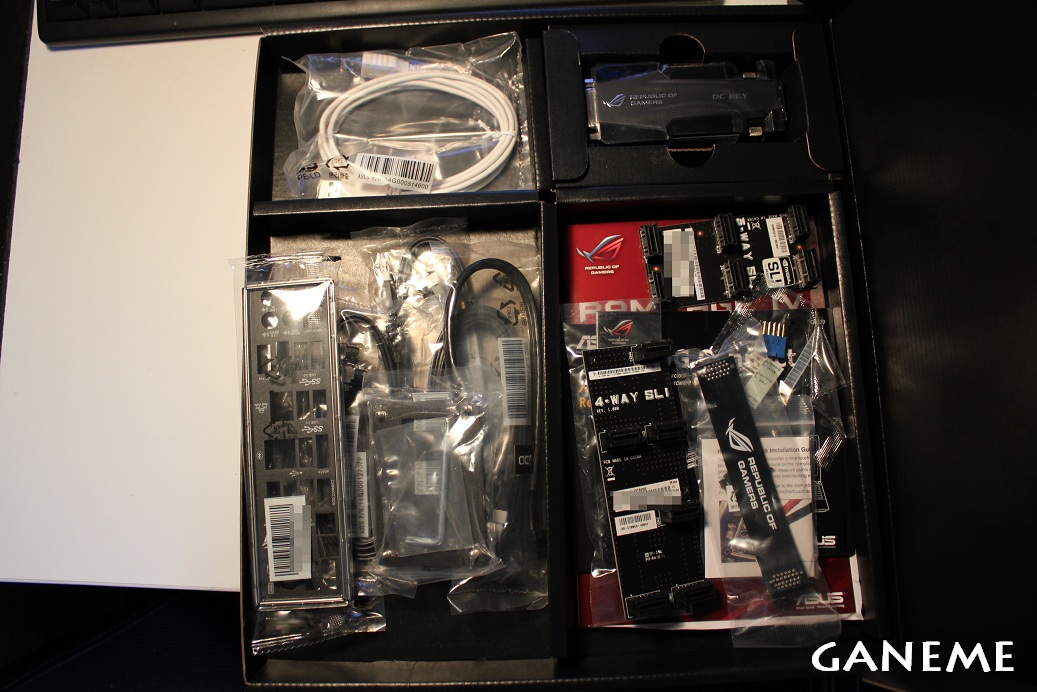 当初はこれを輸入する際、関税が掛かると思っていたのだが 実際には関税はFREEで、謎の税金4%なる名目で 1,000円が追加徴収されてしまった。 今回、化粧箱の質感がR3EやR2Eのあの感じから変更されていた。 そして箱はR2E位の薄さだった。恐らく付属品の関係だろう。 付属品は左上から ・ROG Connectケーブル ・OC KEY ・SATAケーブルとバックパネル、CPUソケットの交換バックプレート ・マニュアル、ドライバディスク、ROG Connectの説明書、SLI系のケーブル類 これだけである。 R3Eのように交換するヒートシンク類は付属していない。 そしてこれが問題のOC KEY… まともに動くんかコレ… それとドライバディスクの中に "ROG Theme"なるものがあったのでインストールしてみたら Windowsのテーマファイルだった。 ちなみに壁紙は10種類くらいがランダムで更新される仕様になっていた。 まぁ設定で変えられるわけだが… とりあえず海を越えてきたブツなので 動くかどうか心配だったが、OSいれて動作確認したところ問題なく動作してくれた。 あとはOCしたときまともに動いてくれることを祈るばかりである。