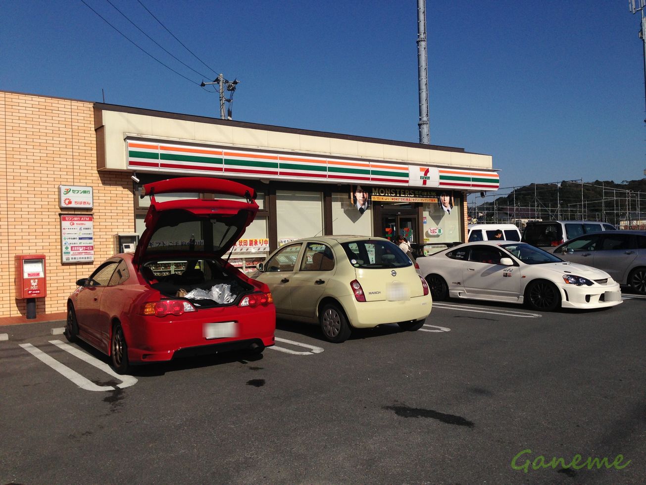 付いてきたのは気づいていたので、速度違反にならないように ちんたら走行に切り替えていたのですが、努力も虚しく停止命令。 そのときはなぜ停められたのかさっぱりわからなくて 若干キレそうだったけど、GTウイングの長さをメジャーで測定されたwww 車検証の車幅から片側16.5cmずつ短くないと違反なのだと。 そのときはingsのZ-POWER Wingのウェットカーボン1650mmの奴を装着していたんだけど インテRの車検証上の車幅は172cm まぁ分かってたけど、違反だわな。 確かになげーんだコレw つーわけで無慈悲な減点+7000円の寄付を命じられました。 その週末、悔しいのぅwwwww悔しいのぅwwwwとかいいつつ 日吉所長と釣ーりんぐ部の活動。 紅白インテで出撃。 千葉に行ったんだけど、鳥が鬱陶しかった… 某コンビニで休憩 いきなり路上で歯磨きが始まった 夕日をバックに。 ちなみに まだ一匹もバスを釣ったことがない。