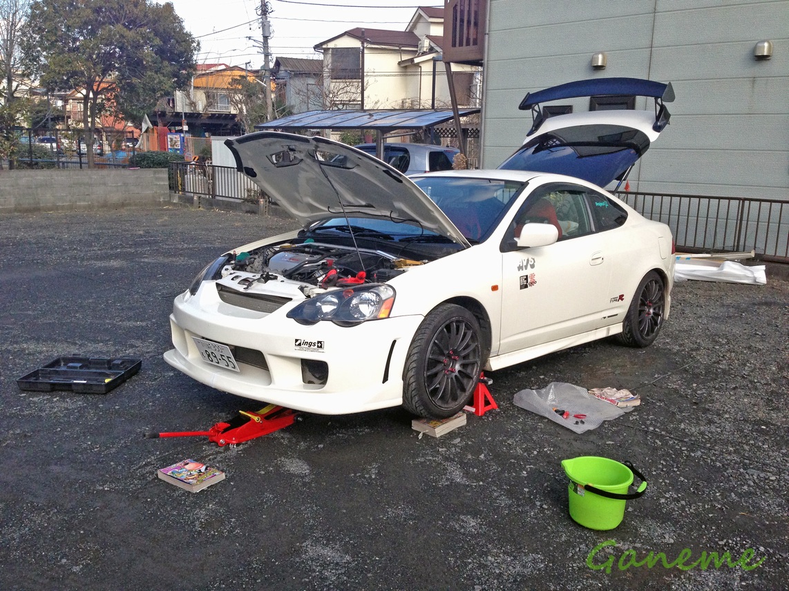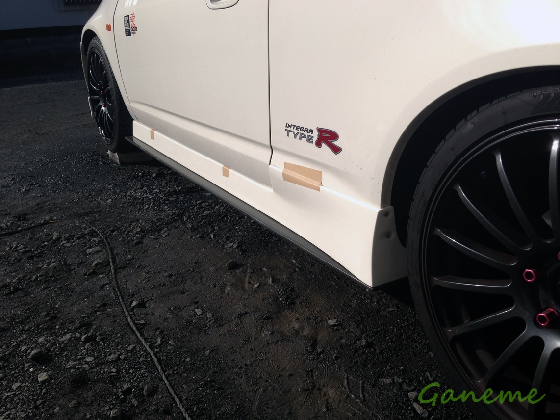 とはいってもサイドステップとはいえ定価7万+塗装も合わせたら 10万いかないくらいの金額になってしまう。 そこでヤフオク漁りの日々を始めて早2ヶ月 ついに先日状態の良いJ'sのサイドステップが出品されたので 怒涛の入札ラッシュを仕掛けておいた。 結果的に半額くらいの価格でゲットすることができた。 しかも出品者が同じ川崎市内ってことで、直接車で取りに行ってきた。 予想通り、相手もDC5乗りだった。 なんでも子供さんができたので純正戻しをしているのだとか… 翌日、天気が晴れたので早速作業を開始した。 まずはingsの割れたサイドステップを摘出するところから。 サイドステップのフロントフェンダー側のネジを2本くらい外したあと ドアを開けたところに見えるネジを3本くらい、あとはリアフェンダー側の2本を外すと 両面テープで固定されている部分のみになるので、そこをカッターとかで切り取りつつ… って感じで簡単に外れた。 わりとバキバキだなwwwww 暇を見つけて直そ。 てっきり純正のサイドステップは摘出済みかと思っていたら なんか下から出てきた ingsのサイドステップは純正サイドの上からかぶせて装着できるのか。 それならJ'sのやつもできるんじゃねーってことでやってみたけど 装着不可☆ 純正のサイド外すしかない… しかし純正のサイドは車の下側からクリップで固定してあるので 下側からのぞかなければならないのだ。 そこでまたジャッキアップ… 馬をかけて何とか純正のサイドステップを外した。 で、ガムテープで仮止めして車体とのフィッティングをみてみたけど かなりいい感じにフィットしてた。 若干色が違うけど、こればっかりはどうしようもない。 いずれオールペンするときまで我慢かな… この日は実家に帰省する日だったので 新幹線の時間の問題で、この日の作業はここまでとなった。 ワイドフェンダーも届いているので 塗装しないとなー。