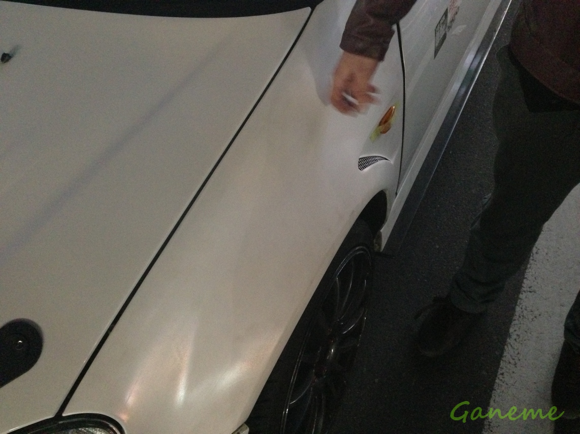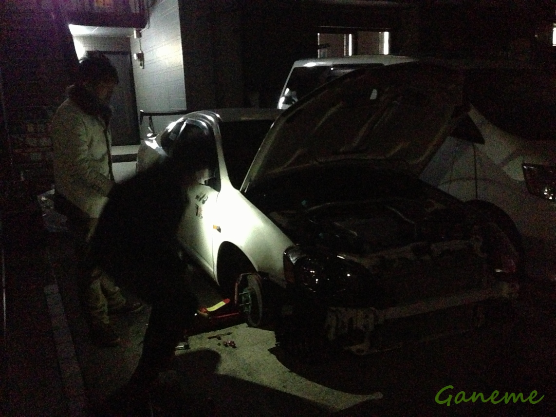 最初は彼のインテのブッシュを 無限の奴に交換する作業をしていたのだが、結局無理で 元に戻す作業をしていたら日が暮れてしまったのだw まぁ俺が行くのが遅かったっていうのもあるけどw 以下 特に下調べもしていたわけではないので 臨機応変に対応した結果、ここまでバラすハメになった。 サイドステップも外している。 この暗さと寒さはヤバかったw グローブが汚いから汚れがwww ってな感じで簡単に取り付けた感じにみえるけど 実際には4時間近く掛かっている。 クリアを吹く回数が少なかったので 光沢はないんだけど、色合いはそこまで違和感がないと思う。 これからクリア吹いたり、水で研いだり、コンパウンドで磨く予定ー 取り付け終了後、彼の友達が勤めているという ガソリンスタンドに行ってきた。(20km近くあるw) ※出発時点で0時過ぎw お友達もいい人だった。 車好きな人はいい人ばかりだね。 このGSで洗車して、給油して、事務所で語って、4時前に帰宅。 さすがに疲労がヤバかったんで、この日は泊めてもらったw 翌日、彼の家を出発したあと みなとみらいのオートバックスに行ってオイル交換とオイルフィルターを交換してから 駐車場に戻って、ワイドフェンダーの塗装の続きをして板橋の自宅に戻った。 ちょっとだけ光沢がでてきたけど 反対側はまだ何も手を着けていないのでこれからかなー。 …って感じの週末でした。