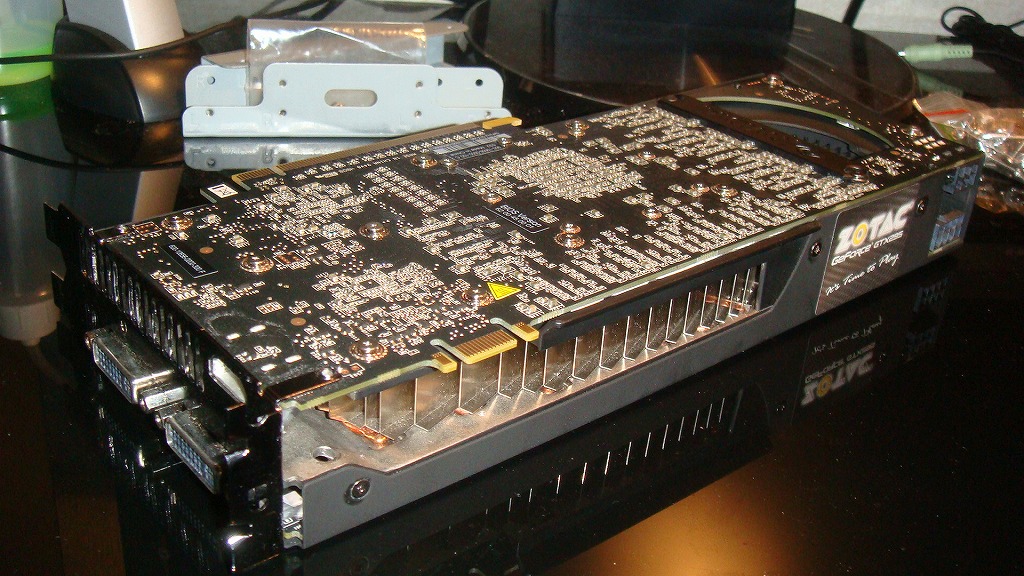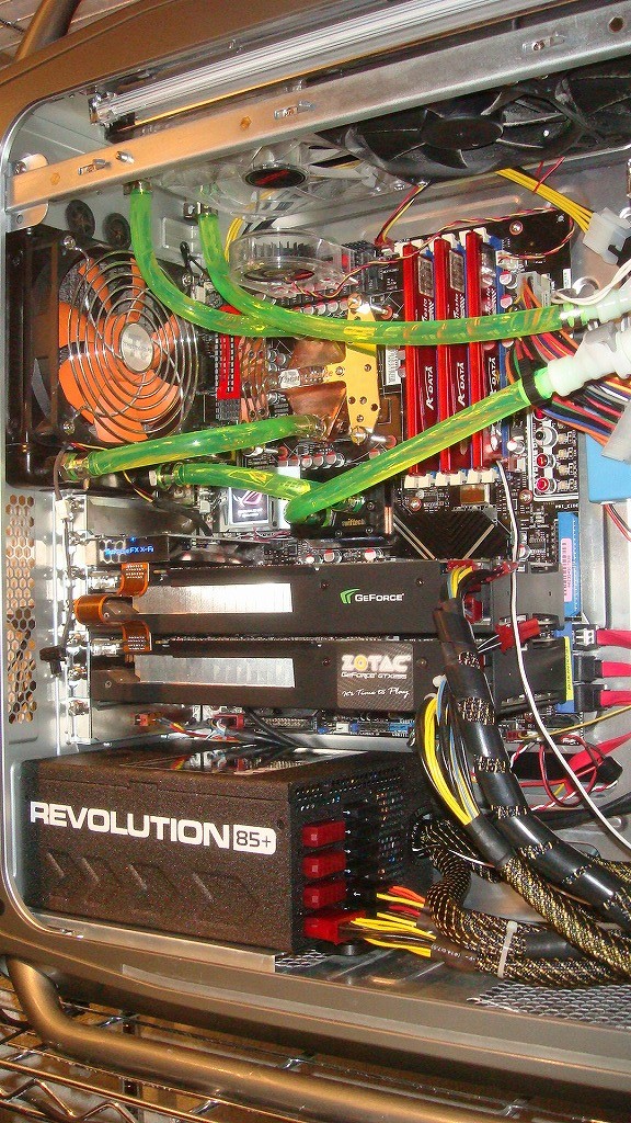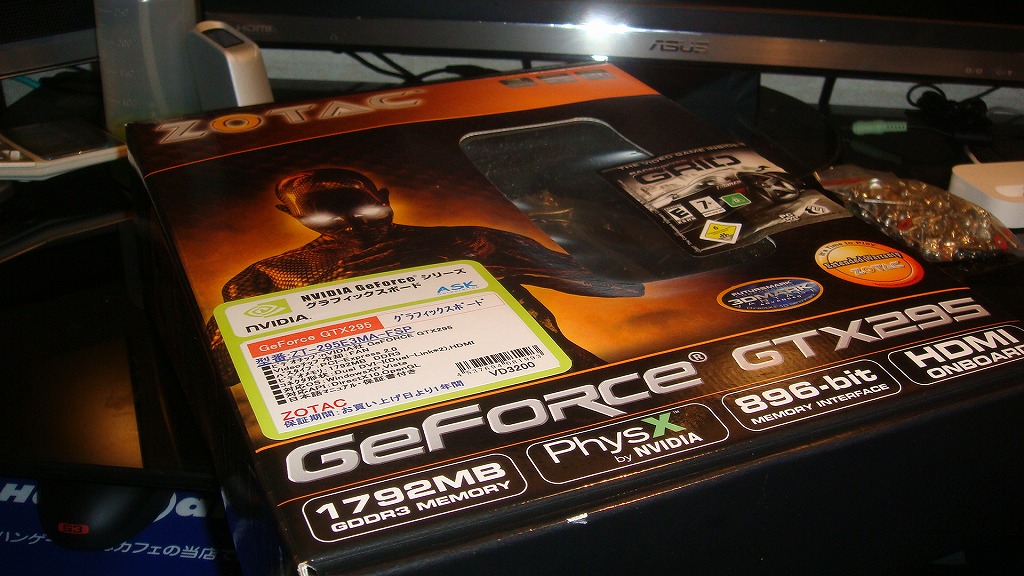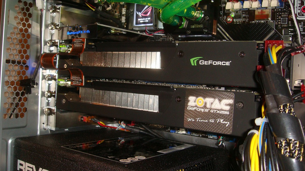 今日届いたもの どーーーーーーーーーーーーーーーーーーーーーん きたぁぁぁああああああああああああ というわけで さっそく組み込んでみたよーーーーー いやーー 壮観ですな… 思わず見とれてしまう… というわけで早速Quad SLIの設定をするべく Windowsを立ち上げた。 まずは普段使うXPからってことで XPを立ち上げたんだけど GPU-Zから見ると Enabled GPUが二つしか認識されていない デバイスマネージャーでみると きちんと4コア認識されていたので ドライバ入れなおさなきゃだめなのかなーとか 勝手に思って XPのドライバを再インストールしてみた。 しかし一向に変わらない そこでプライマリとセカンダリの位置を変えてみた ようは今まで使っていたヤツと今日届いたヤツの取り付け位置を 交換してみたのである しかし一向に変わらない ここでガネは焦燥感に駆られた 「もしやOC版と通常版ではQuadSLIができないのではないか…」と。 しかし15分でこんな高い買い物をあきらめるわけにはいかない。 そこで我等がグーグル大先生に教えを請うことにした とりあえず一つ目の某メーカーサイトをみると すぐに答えは見つかった 「※QuadSLIはMicrosoft Windows Vistaでのみ動作いたします」 な…なんだ…と… まったく知らなかった。 WindowsXPはQuad SLIが使えないとは… まぁ今回はこれでひとつまた勉強になったよね。 めでたしめでたし。 というわけで今度はVistaに切り替えてやってみたのだが なぜかドライバのインストール段階で ブルースクリーンエラーがでる;; ここで正直ちょっと萎えた。 Vistaでできるという情報を元にやってみたのに なぜかXPより結果がひどい;; ここであきらめるわけにはいかないので ディスプレイのDVIケーブルを別の場所に差してみた (裏側からみて左上にあたる部分) すると… キターーーーーーーーーーーーーーーーーーーーーーーーーーーーー というわけで今からとりあえず定格でベンチ回してみますー