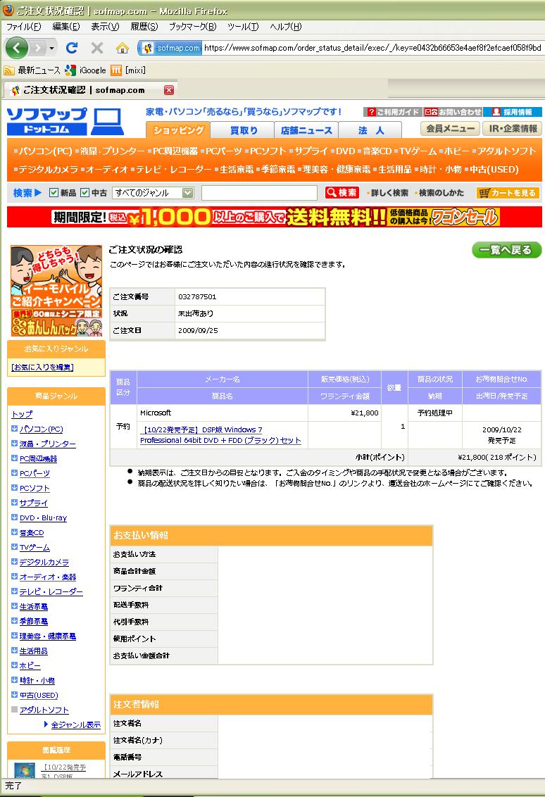 なんかYahooニュースだったかどこだったか忘れたけど サイト巡回してたら 「Windows7予約開始」ってあったので 予約してきましたー!! どこで予約しようかなーって迷ったけど 無難に祖父にしときました。 もっと高いと思ったけど 意外とそうでもなかったε-(´∀`*)ホッ 今回はWindows7 Professional 64bitにしてみた。 さて 今からメモリ増設計画を練らねば!!